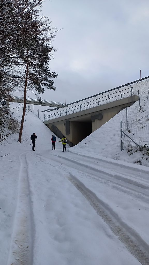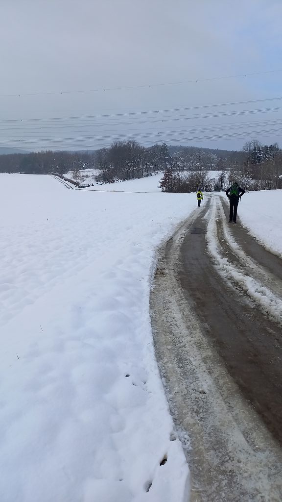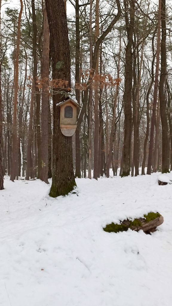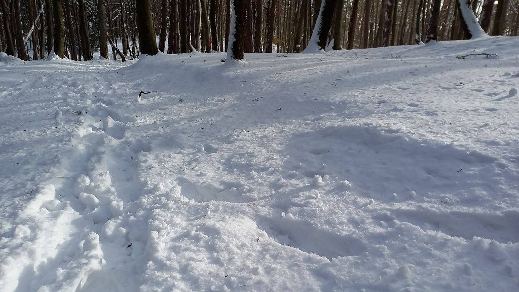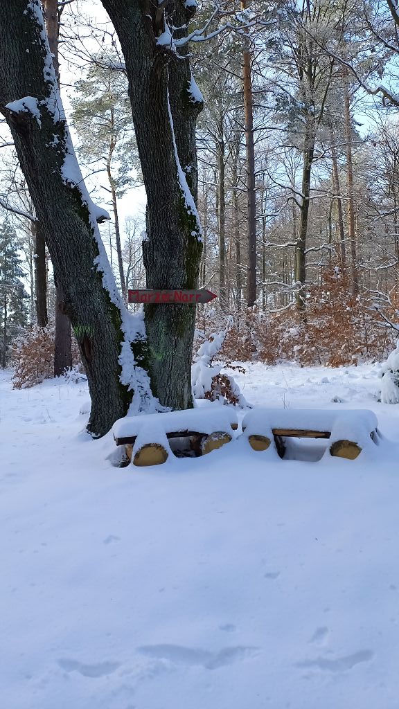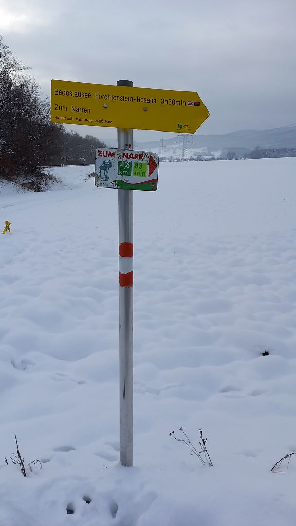 Etwas außerhalb von Marz, an der B50 in Richtung Sieggraben wo das Burgenland am schmalsten aber auch am zweithöchsten ist, starten wir unsere Tour. Wir beschließen, dass wir die Schneeschuhe im Auto lassen und gehen vorerst der Markierung „Der Narr“ folgend auf dem etwas vereisten Güterweg in Richtung S31. Wir queren die Schnellstraße bei einer Unterführung und wandern bergauf auf einer schneebedeckten Forststraße durch den Wald. Der Nebel beginnt sich etwas zu lichten und es wird auch etwas wärmer.Im Hochwald kommt dan rechtzeitig die Sonne durch und als wir nach knapp 6km beim Narr ankommen. Das ist eine etwa 1m hohe, geschnitzte Holzfigur unter einem Gestell mit Dach. Ein Bankerl lädt zu einer Trinkpause ein bevor es auf einem Waldweg weiter durch den Schnee geht. Da das Wetter zunehmend besser wird entscheiden wir uns für die große Runde, steigen weiter hinauf und umrunden den Greimkogel. Bei einer großen Wegkreuzung gehen wir weder zur Rosalia, auch nicht nach Sieggraben, Schwarzenbach oder gar nach Kobersdorf sondern in Richtung Hubertuskapelle (das ist heuer schon die Vierte) und dann weiter Richtung „Stausee Forchtenstein“. Auf einer leicht gatschigen Forststraße erreichen wir schließlich die Abzweigung zurück auf den Zentralalpenweg 02 (kein Schmäh, der beginnt bei der Ungarischen Pforte nahe Hainburg und geht bis Feldkirch in Vorarlberg) welcher uns wieder unter der S31 zum Ausgangspunkt bringt.