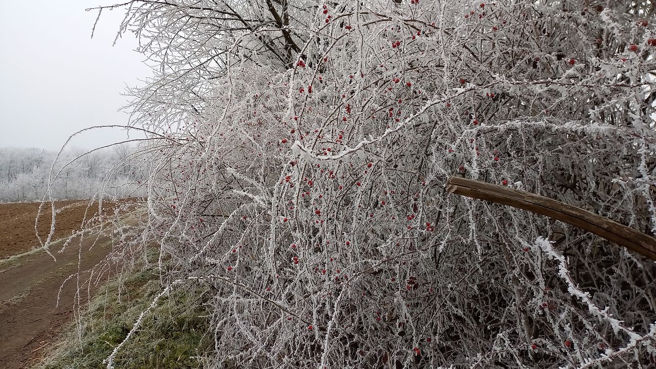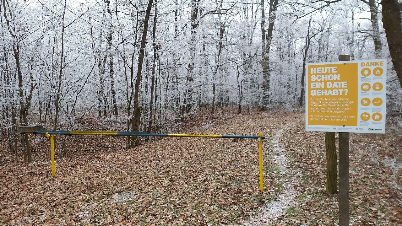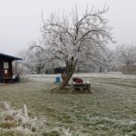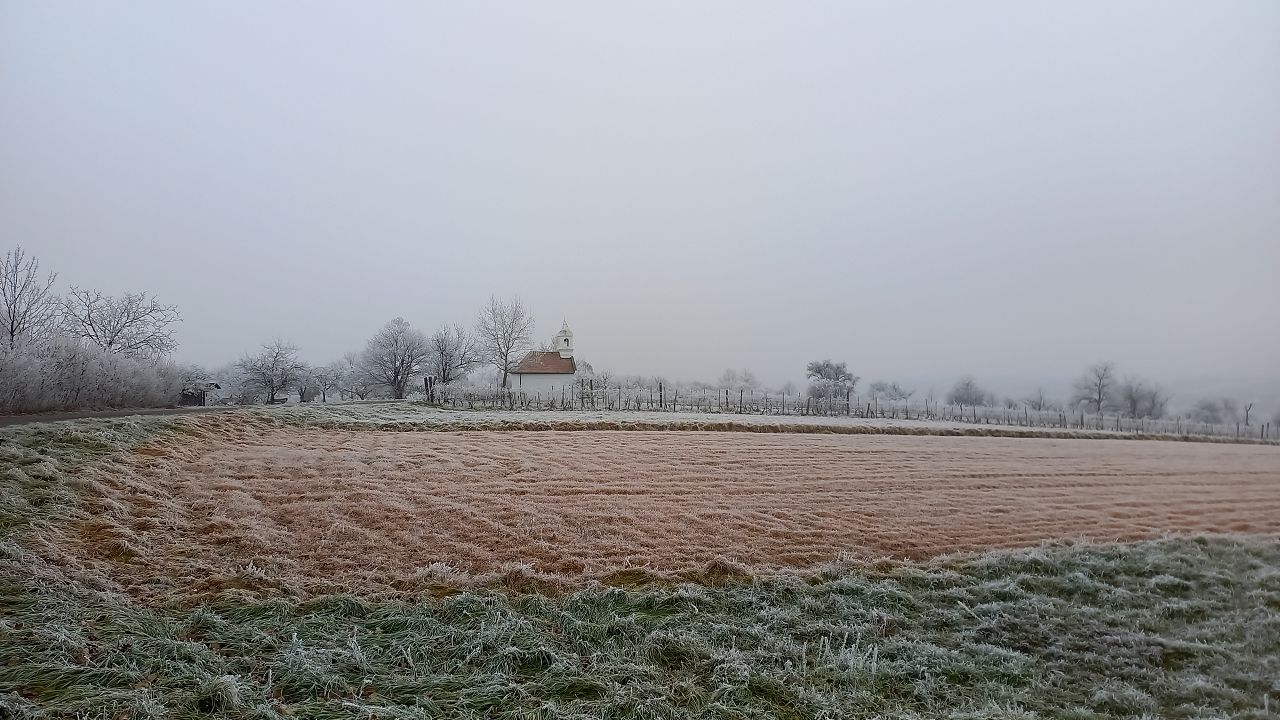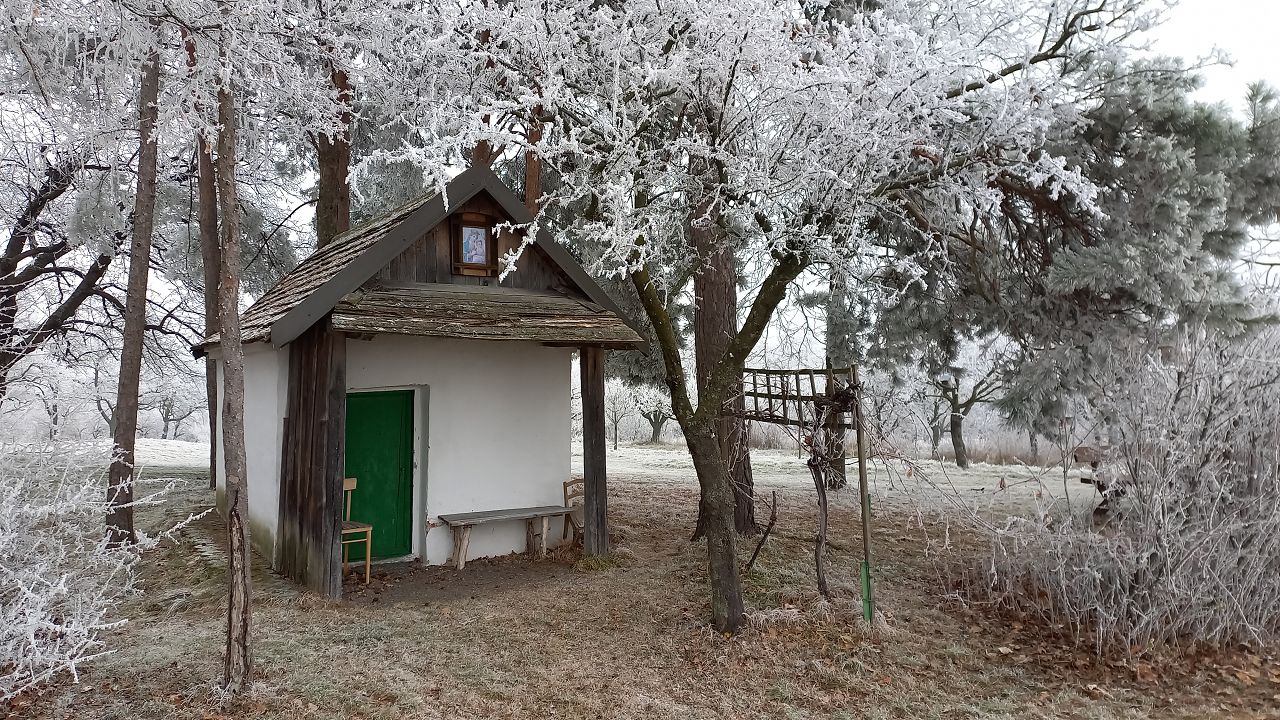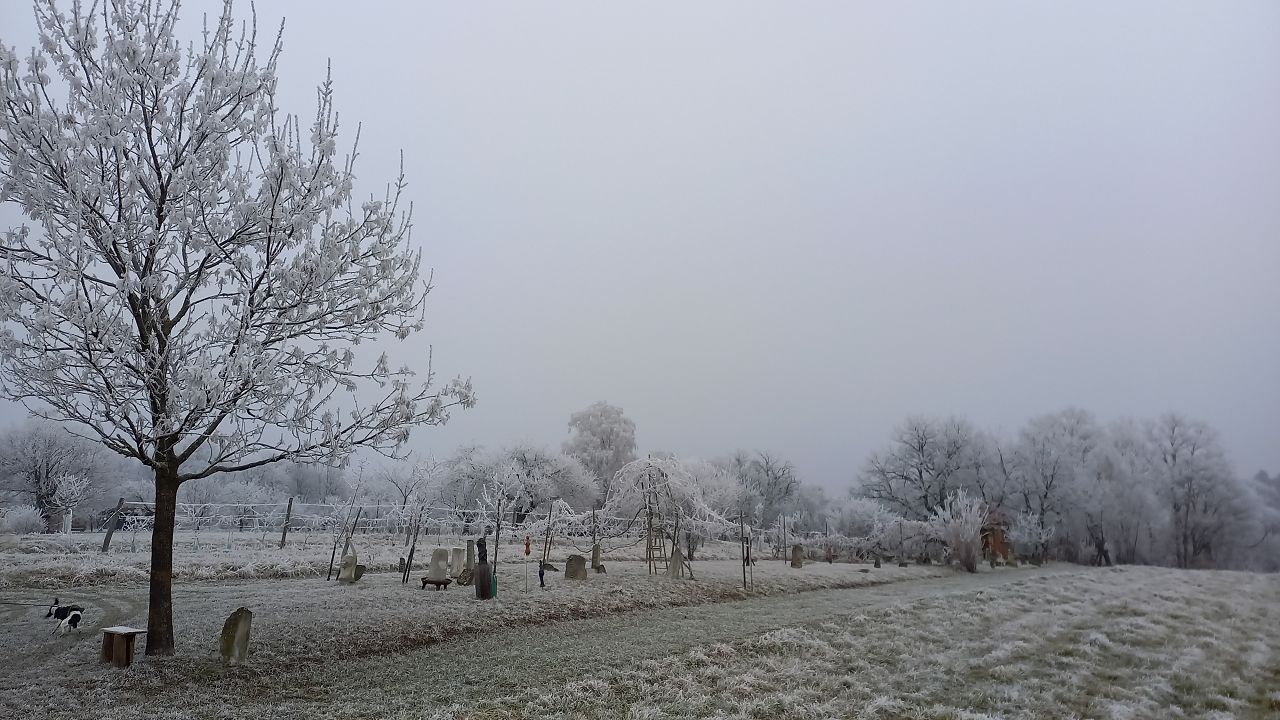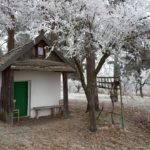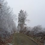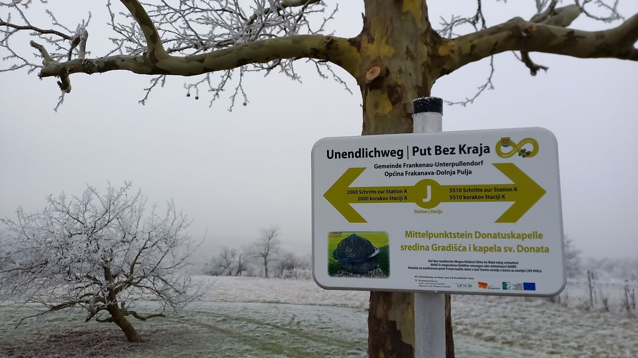 Wir beginnen das Neue Jahr mit einer Wanderung zum Mittelpunkt. Auf den Waldwegen knirscht der gefrorene Boden bei jedem Schritt und alle Pflanzen sind mit einer dicken Schicht Rauhreif überzogen … schön pitoresk! Auf dem bekannten Weg kommen wir gut voran und bald erreichen wir die Weinberge von Unterpullendorf. Auf der asphaltierten Straße gehen wir zunächst bei der alten Weingartenhütte vorbei und erreichen kurz danach die uralte Kapelle. Die meisten Weinstöcke sind schon gerodet und auch von den ursprünglichen Streuobstwiesen mit den alten Obstsorten ist nicht mehr viel übrig. Aber dieser Ort ist trotzdem bei jeder Jahreszeit einen Besuch wert. Neuerdings gibt es auch eine Bücherei, eine Hütte mit zahlreichen Büchern und Sitzgelegenheiten und ein Stück weiter einen Skulpturenpark mit verschiedensten Steinkreationen. Es scheint etwas magisches über der ursprünglichen Landschaft zu liegen und die Kapelle beim Mittelpunkt ist ein richtiger „Kraftplatz“. Bei klarem Wetter kann man die Kapelle vom Günser Gebirge oder auch von den Landseer Bergen erspähen. Neben der Kapelle befindet sich der Mittelpunktstein und einige Bankerl die zum Verweilen und Relaxen einladen.