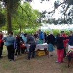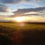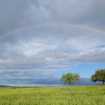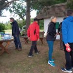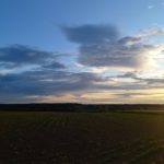 Es dämmert bereits und als wir das erste Marterl bei der ehemaligen alten Ziegelei an der Straße nach Unterloisdorf erreichen, wird es hell am Horizont. Leider liegen über Ungarn im Osten einige Wolken und verhindern so den freien Blick auf unser Zentralgestirn. Die Teilnehmer trällern ein kurzes Lied und weiter geht es hinauf auf den Hügel zum nächsten Marterl am Straßenrand der B61. Ein weiteres Lied (© Beatles – Here Comes The Sun) und die ersten Sonnenstrahlen blinzeln hinter den Wolken hervor. Nun geht es auf der Hochebene südöstlich in Richtung Kleinmutschen und bald sehen wir die Sonne in voller Pracht über dem Lutzmannsburger Weingebirge aufgehen. Dann geht es bald links hinunter zur Landesstraße nach Frankenau und bei der Abzweigung zum „Geographischen Mittelpunkt“ erreichen wir eine kleine Kapelle. Nach einer kurzen Geschichte zur Enstehung des Bauwerks folgt ein Lied und weiter geht es auf dem Güterweg zur Brücke über den Stooberbach. Ein Blick nach N zeigt uns einen schönen Regenbogen und zeugt vom Nieselregen in Unterpullendorf. Dann vorbei am Rastplatz des Radweges und hinauf durch den Zerwald mit den Pingen (vom norischen Eisenerzabbau) hinauf zur Hütte des ehemaligen Weingartenhüters. Dahinter haben schon „gute Geister“ ganze Arbeit geleistet und ein opulentes Frühstück vorbereitet.
