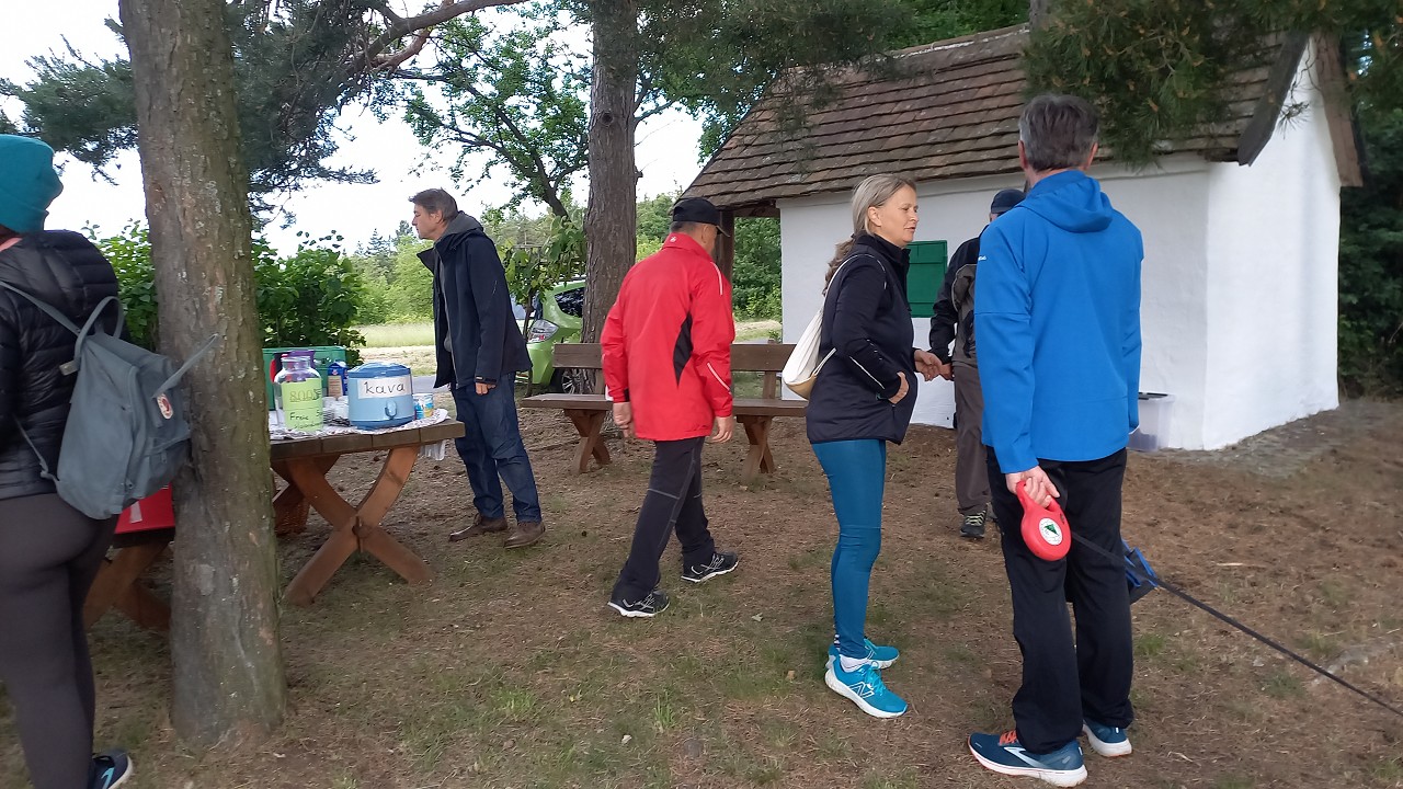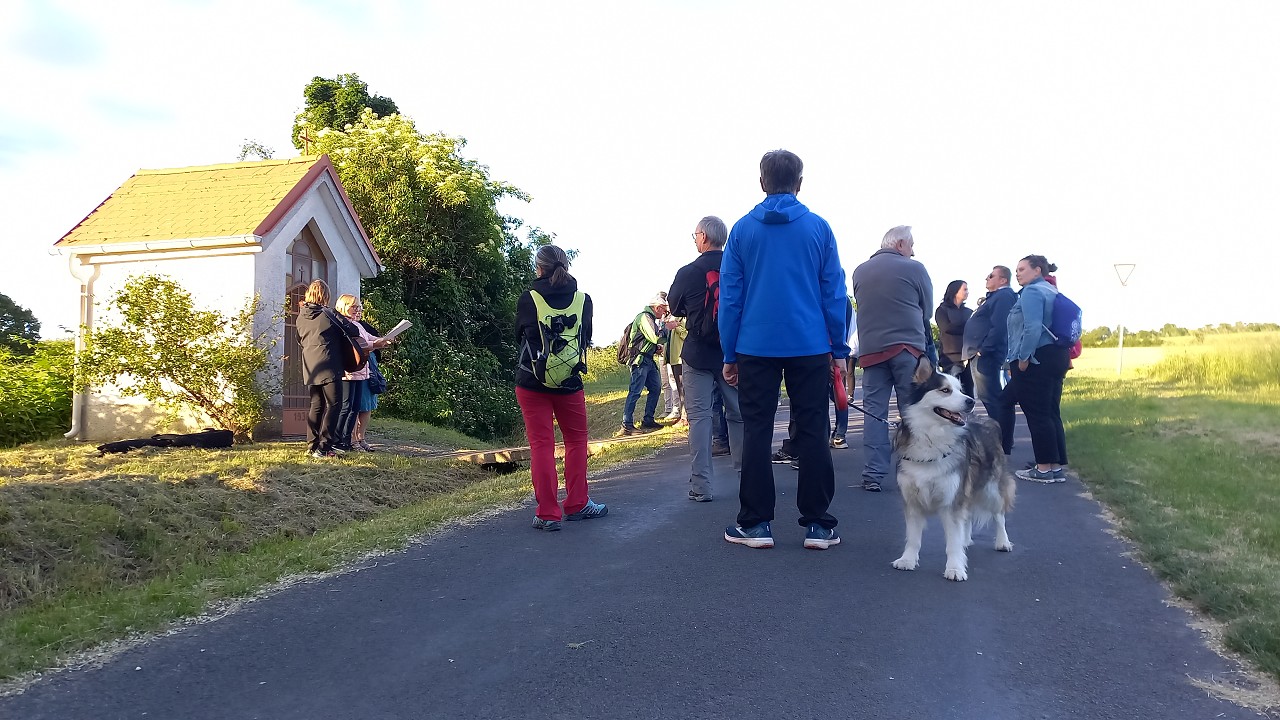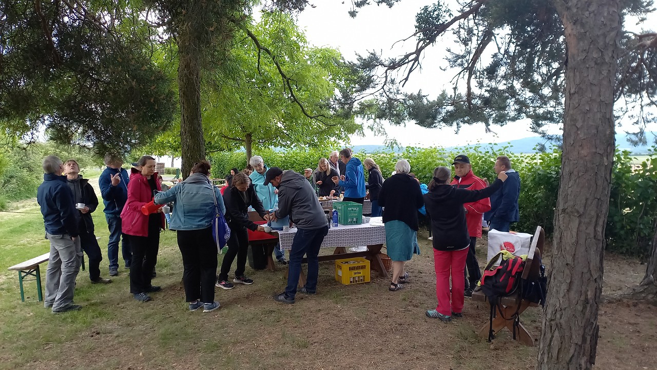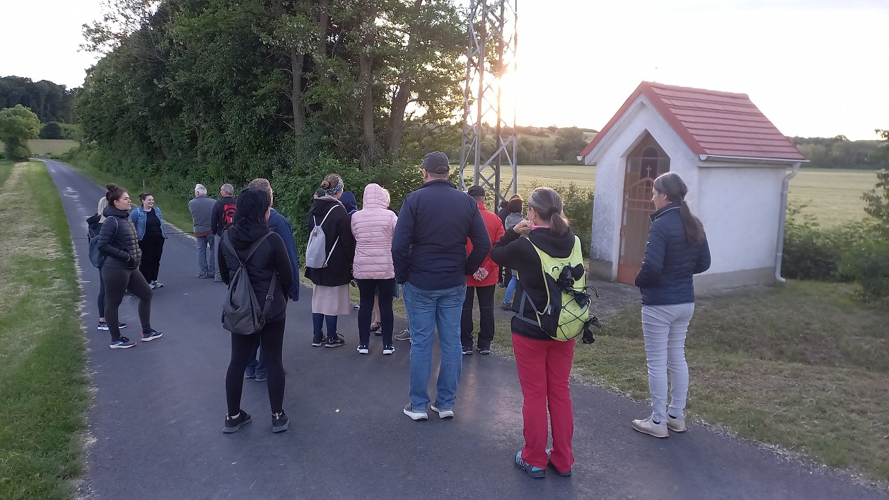 Es dämmert bereits und als wir das erste Marterl bei der ehemaligen alten Ziegelei an der Straße nach Unterloisdorf erreichen, wird es hell am Horizont. Leider liegen über Ungarn im Osten einige Wolken und verhindern so den freien Blick auf unser Zentralgestirn. Die Teilnehmer trällern ein kurzes Lied und weiter geht es hinauf auf den Hügel zum nächsten Marterl am Straßenrand der B61. Ein weiteres Lied (© Beatles – Here Comes The Sun) und die ersten Sonnenstrahlen blinzeln hinter den Wolken hervor. Nun geht es auf der Hochebene südöstlich in Richtung Kleinmutschen und bald sehen wir die Sonne in voller Pracht über dem Lutzmannsburger Weingebirge aufgehen. Dann geht es bald links hinunter zur Landesstraße nach Frankenau und bei der Abzweigung zum „Geographischen Mittelpunkt“ erreichen wir eine kleine Kapelle. Nach einer kurzen Geschichte zur Enstehung des Bauwerks folgt ein Lied und weiter geht es auf dem Güterweg zur Brücke über den Stooberbach. Ein Blick nach N zeigt uns einen schönen Regenbogen und zeugt vom Nieselregen in Unterpullendorf. Dann vorbei am Rastplatz des Radweges und hinauf durch den Zerwald mit den Pingen (vom norischen Eisenerzabbau) hinauf zur Hütte des ehemaligen Weingartenhüters. Dahinter haben schon „gute Geister“ ganze Arbeit geleistet und ein opulentes Frühstück vorbereitet.