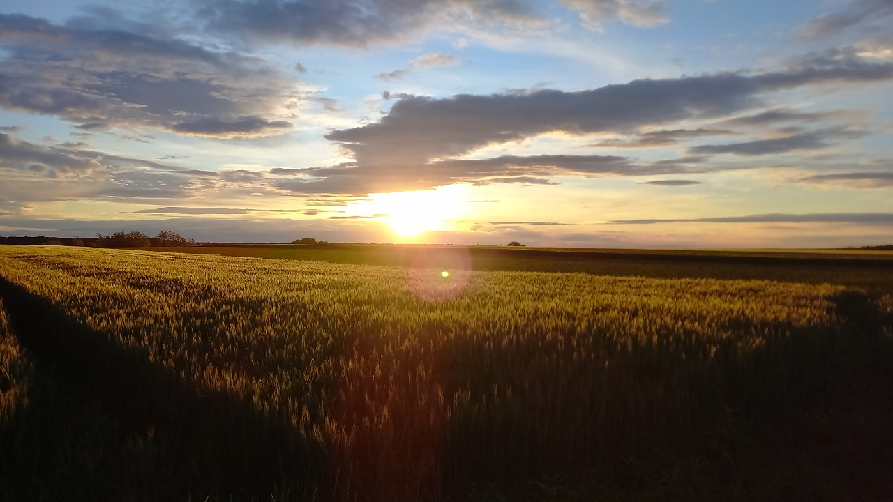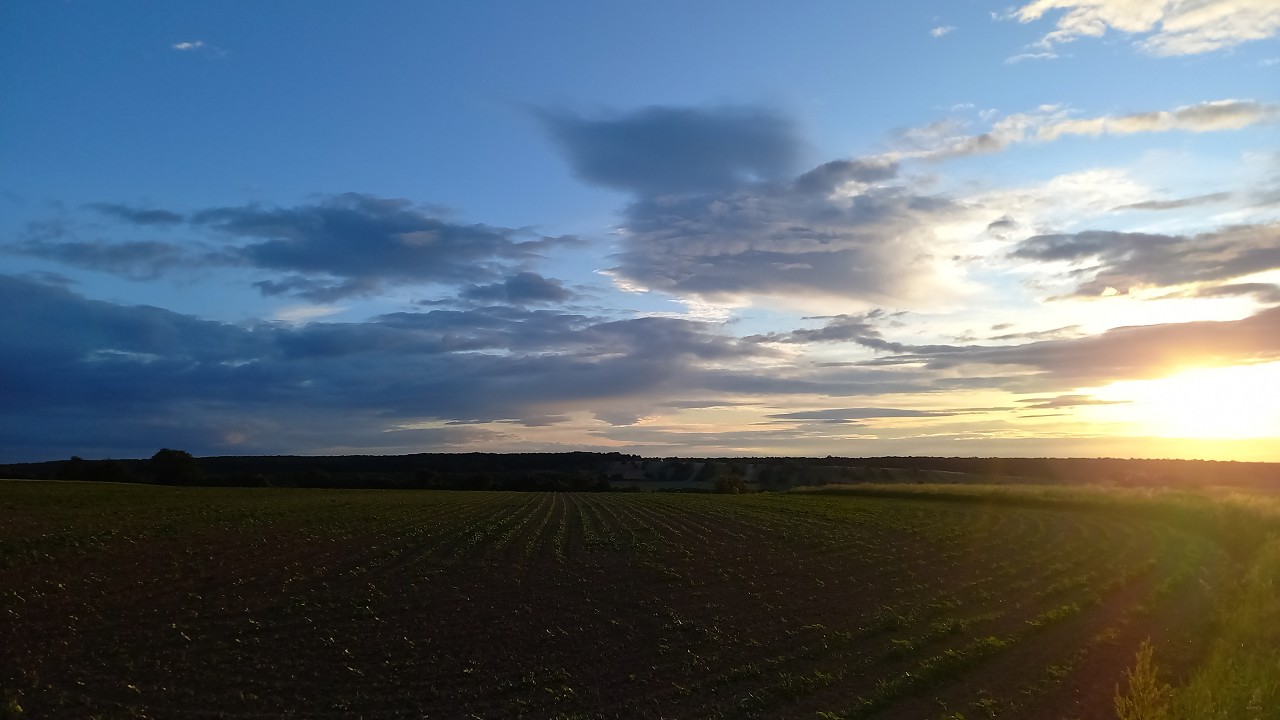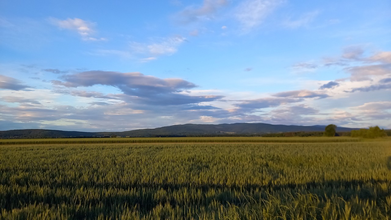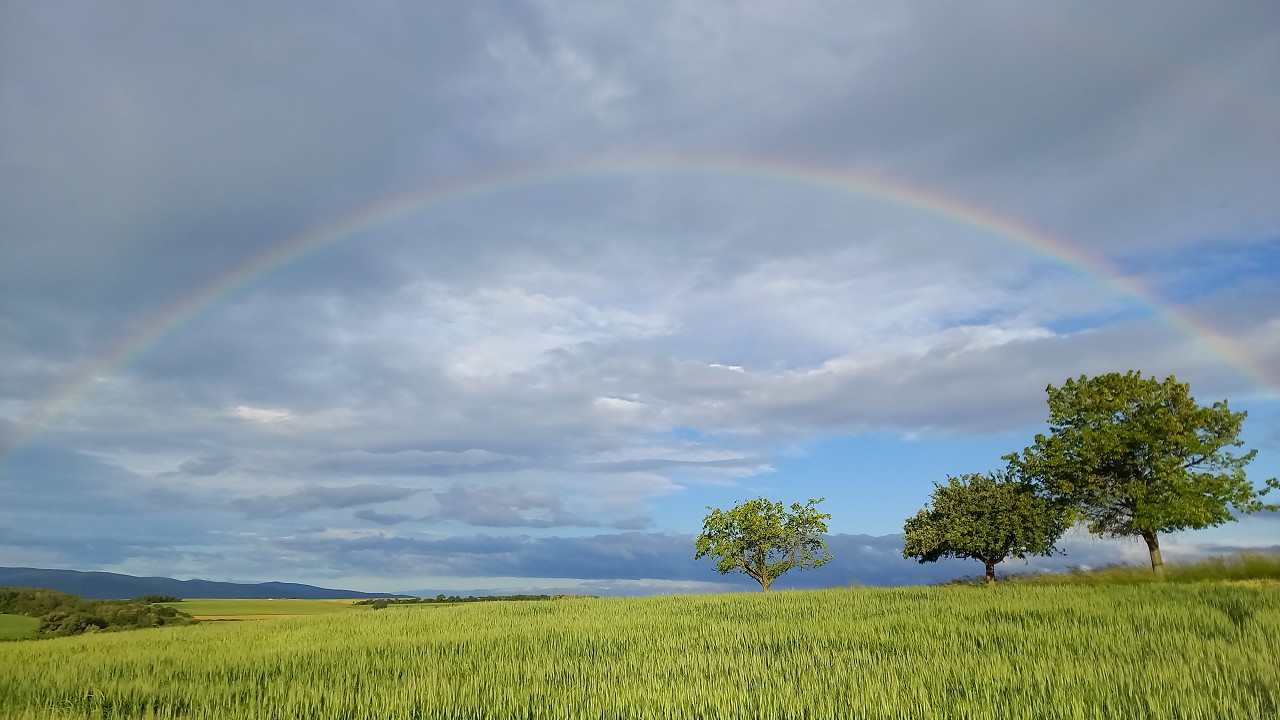 Es dämmert bereits und als wir das erste Marterl bei der ehemaligen alten Ziegelei an der Straße nach Unterloisdorf erreichen, wird es hell am Horizont. Leider liegen über Ungarn im Osten einige Wolken und verhindern so den freien Blick auf unser Zentralgestirn. Die Teilnehmer trällern ein kurzes Lied und weiter geht es hinauf auf den Hügel zum nächsten Marterl am Straßenrand der B61. Ein weiteres Lied (© Beatles – Here Comes The Sun) und die ersten Sonnenstrahlen blinzeln hinter den Wolken hervor. Nun geht es auf der Hochebene südöstlich in Richtung Kleinmutschen und bald sehen wir die Sonne in voller Pracht über dem Lutzmannsburger Weingebirge aufgehen. Dann geht es bald links hinunter zur Landesstraße nach Frankenau und bei der Abzweigung zum „Geographischen Mittelpunkt“ erreichen wir eine kleine Kapelle. Nach einer kurzen Geschichte zur Enstehung des Bauwerks folgt ein Lied und weiter geht es auf dem Güterweg zur Brücke über den Stooberbach. Ein Blick nach N zeigt uns einen schönen Regenbogen und zeugt vom Nieselregen in Unterpullendorf. Dann vorbei am Rastplatz des Radweges und hinauf durch den Zerwald mit den Pingen (vom norischen Eisenerzabbau) hinauf zur Hütte des ehemaligen Weingartenhüters. Dahinter haben schon „gute Geister“ ganze Arbeit geleistet und ein opulentes Frühstück vorbereitet.