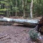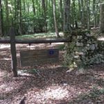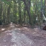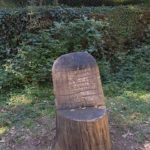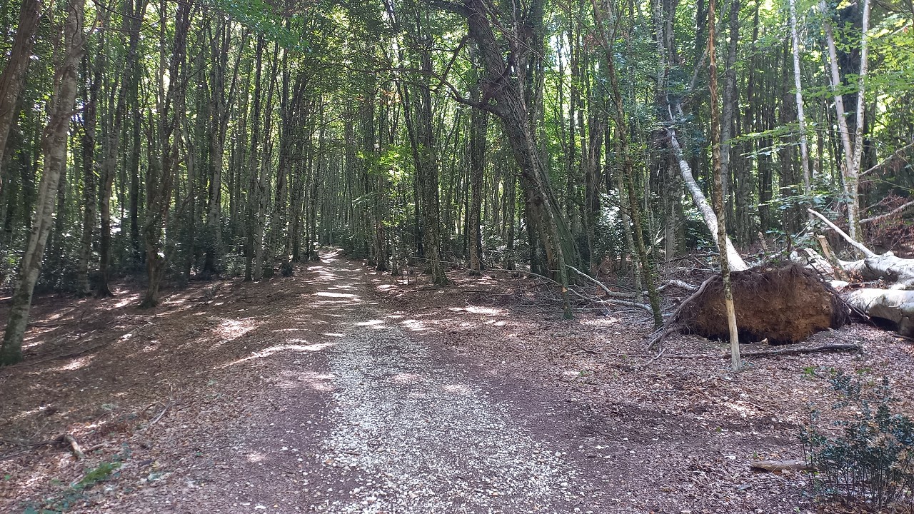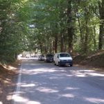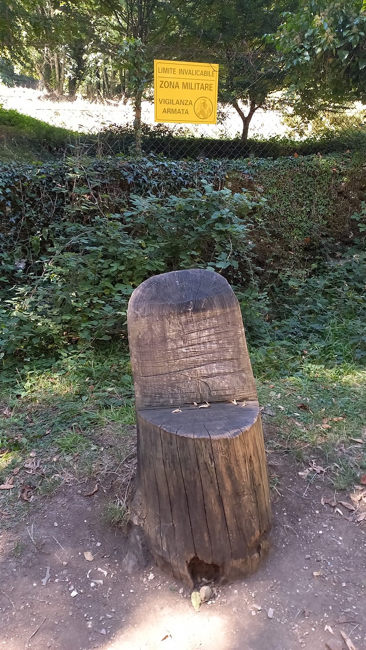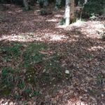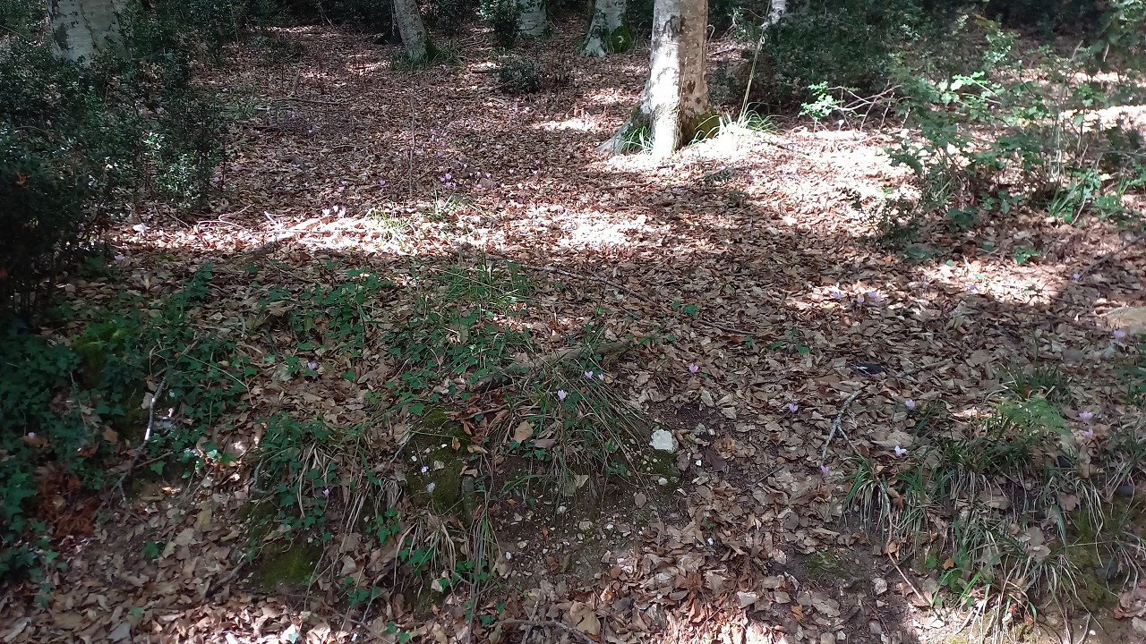 Hier beginnt scheinbar ein Wanderweg und wir folgen auf einem Forstweg einer schwachen Markierung  in den Wald hinein. Es ist wirklich ein wahrer Urwald mit mächtigen Buchen und die Vegetation ist alles andere als mediteran. Alte Grenzsteine markieren den Waldweg und gelegentlich gibt es auch Absperrungen mit Stacheldraht und Hinweisen auf ein militärisches Sperrgebiet. Der Weg führt beinahe schnurgerade an einem tiefen Graben entlang und es gibt weder links noch rechts eine Abbiegemöglichkeit. Nach einiger Zeit findet sich eine Weggabelung und Wegweiser mit einem Ziel in 1½ h Entfernung dem wir sicher nicht folgen wollen. Der andere Weg scheint auf der Karte gar nicht auf also kehren wir um und wandern den gleichen Weg wieder zurück.