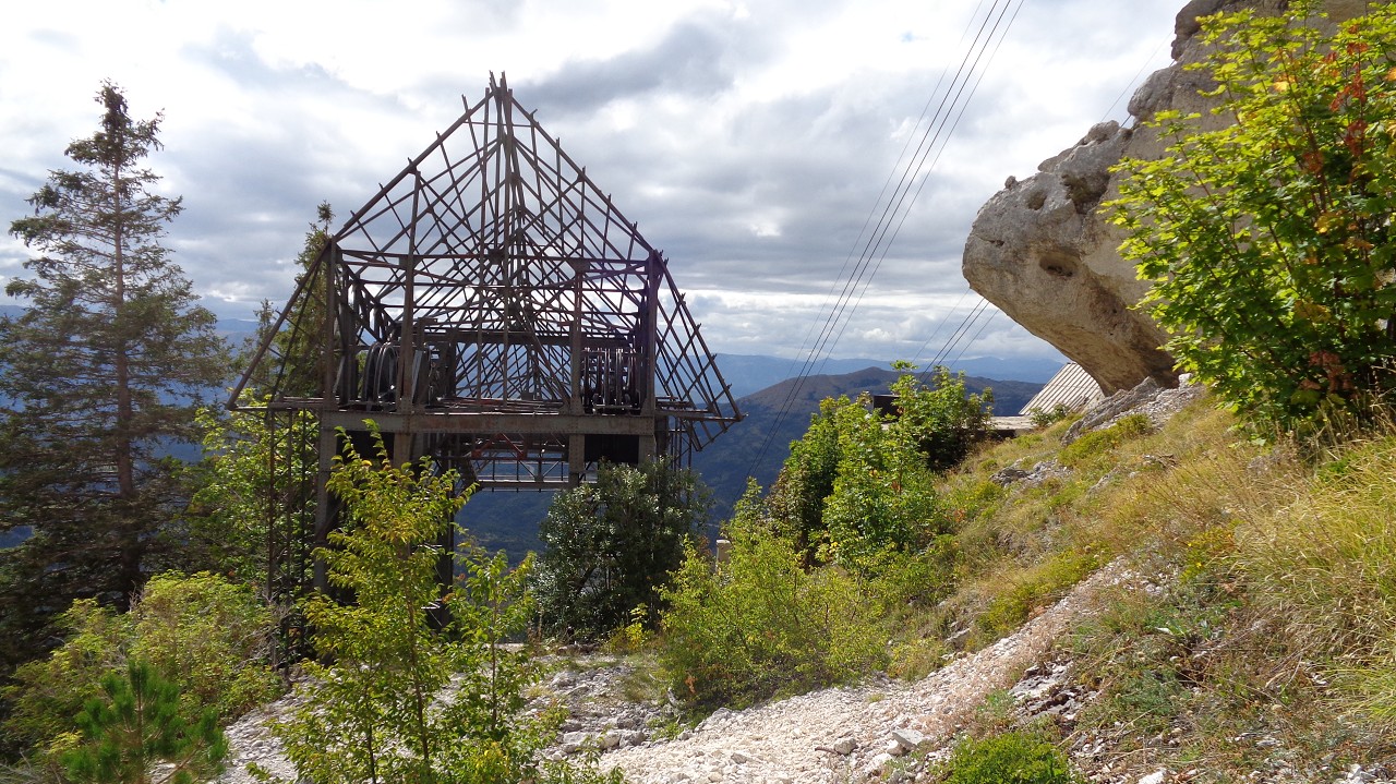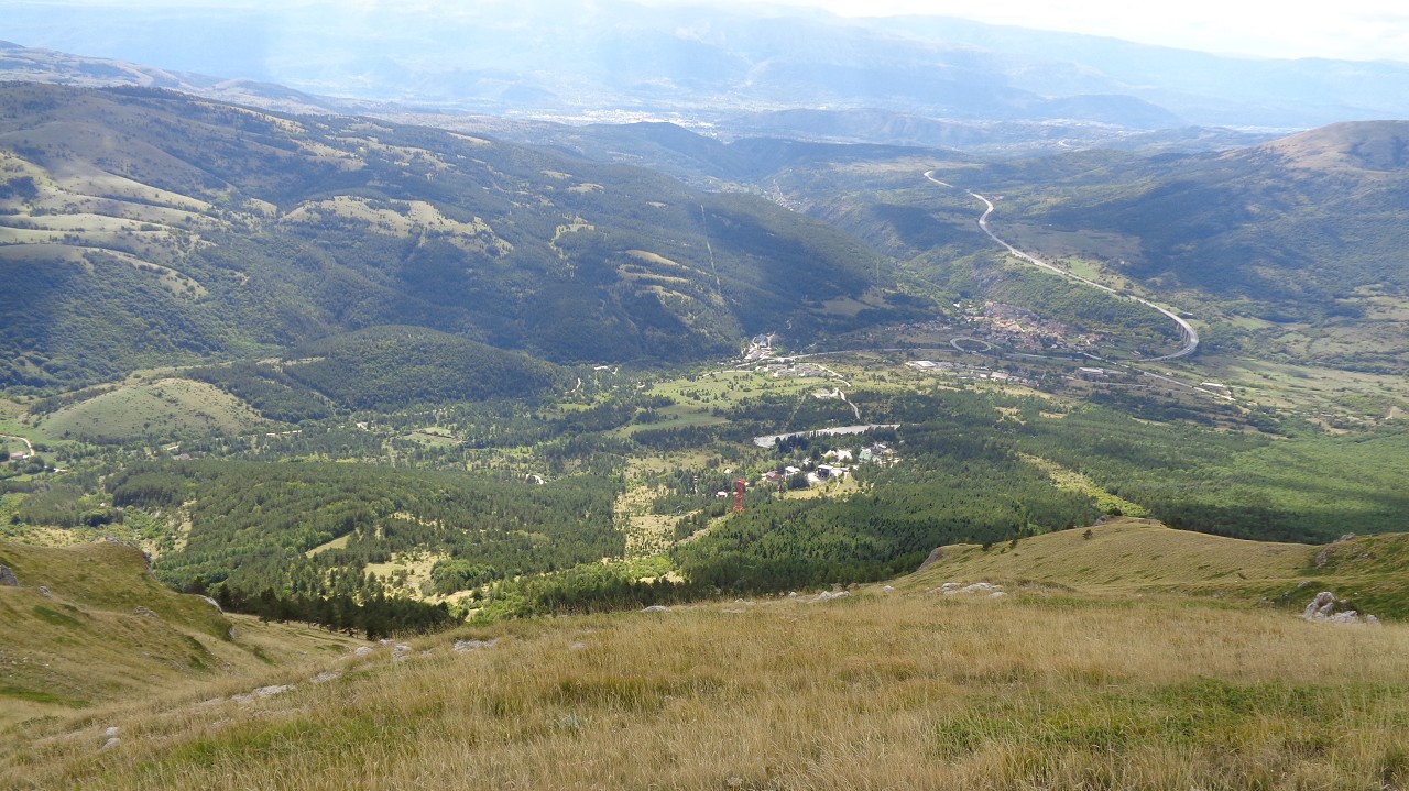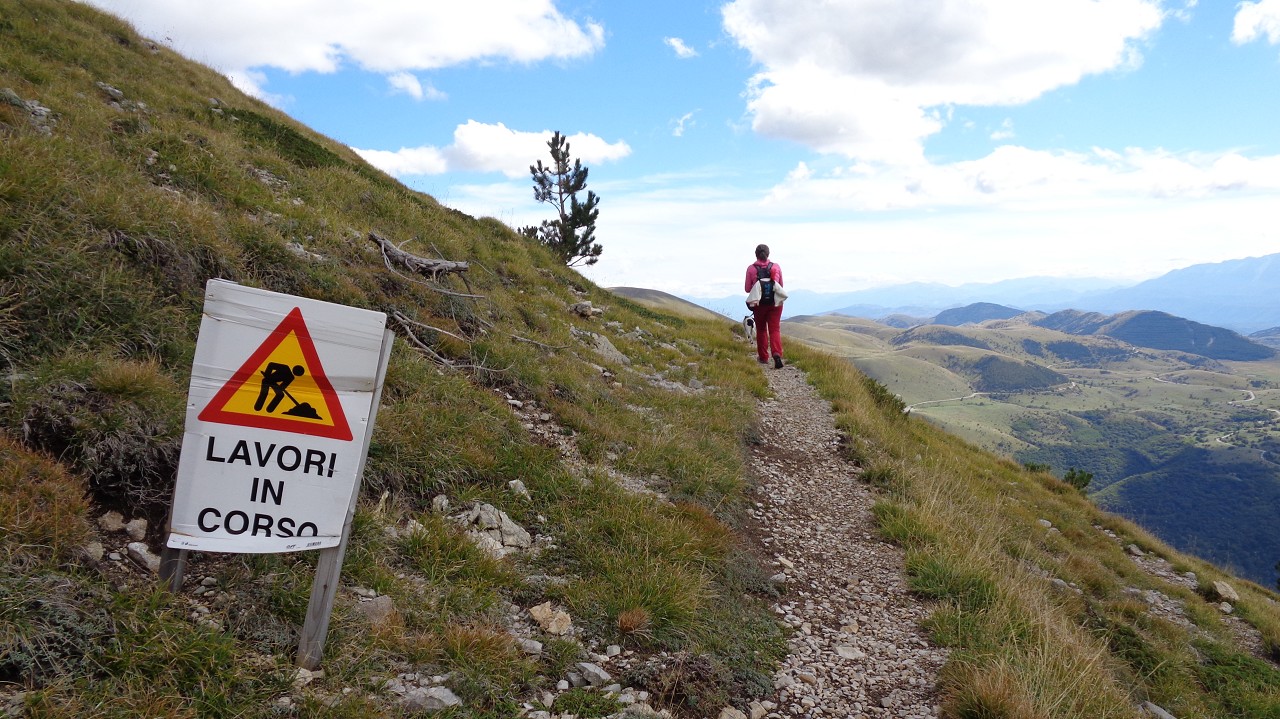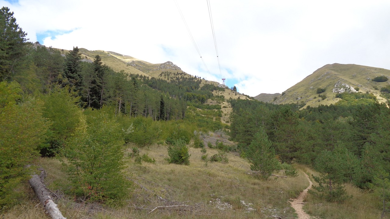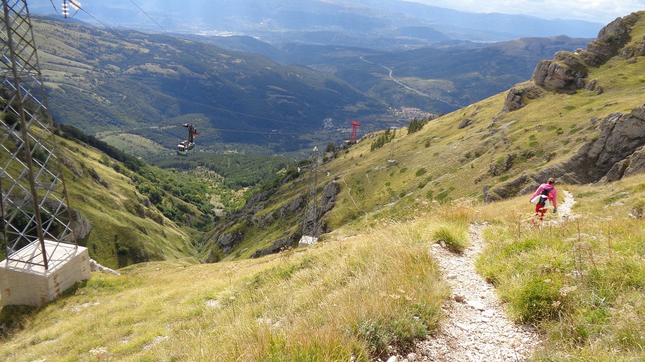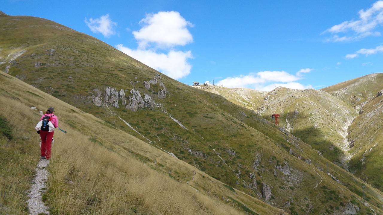 Vom Weiler Fonte Cerreto führt eine kurvenreiche Straße sowie die Seilbahn Funivia del Gran Sasso D’Italia hinauf ins Schigebiet und zum Observatorium auf der Hochebene Campo Imperatore. Die Bahn ist aber „Chiuso per Manutenzione“ (= wegen Wartungsarbeiten außer Betrieb) und so nehmen wir die 1015 Hm bis zur Bergstation zu Fuß in Angriff. Der Gipfel wäre dann nochmal 900 m höher.