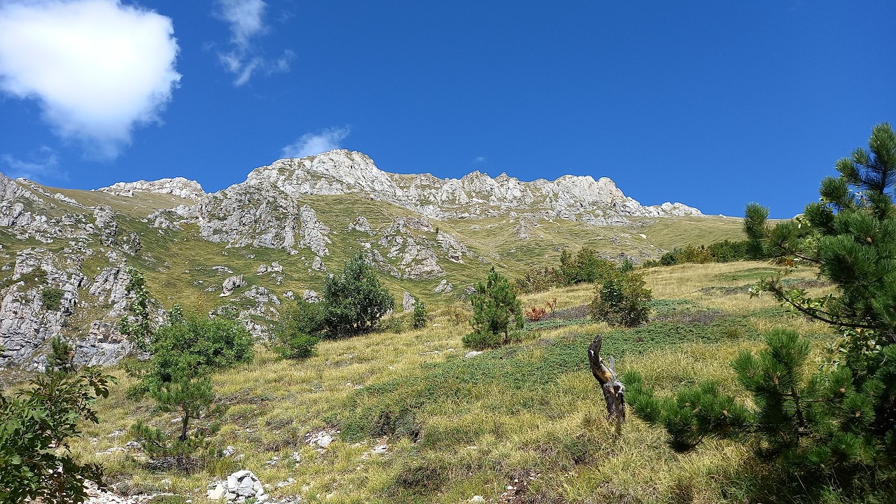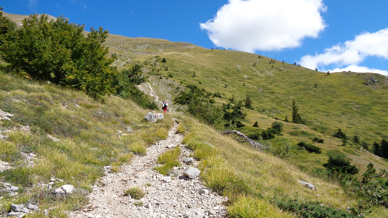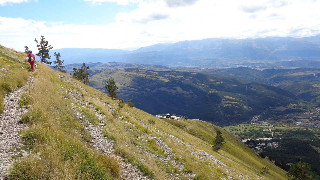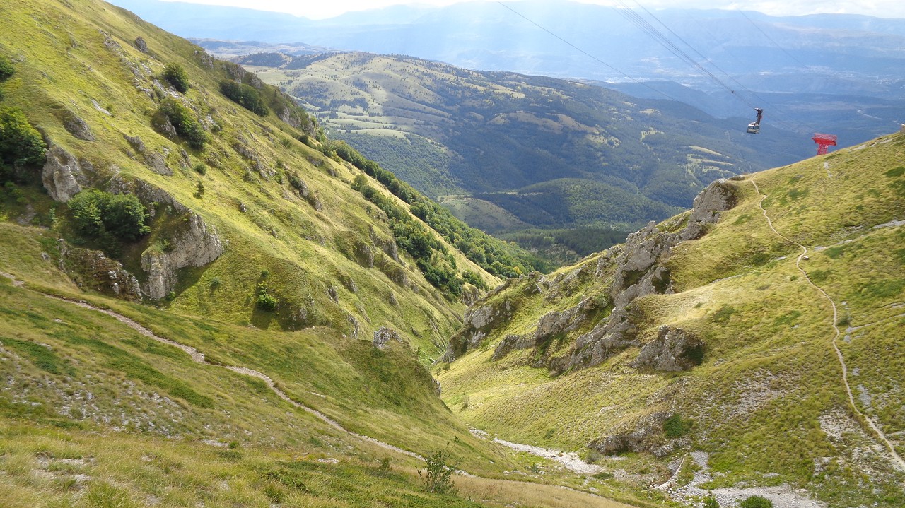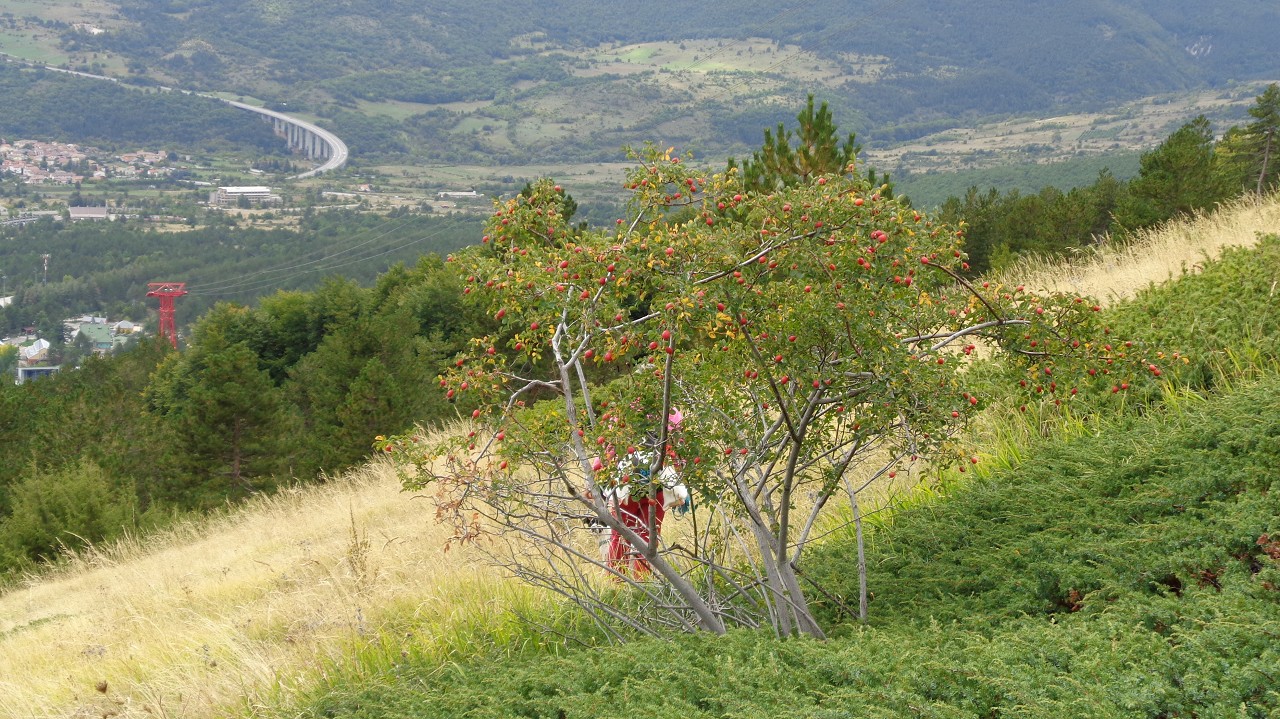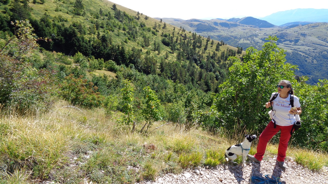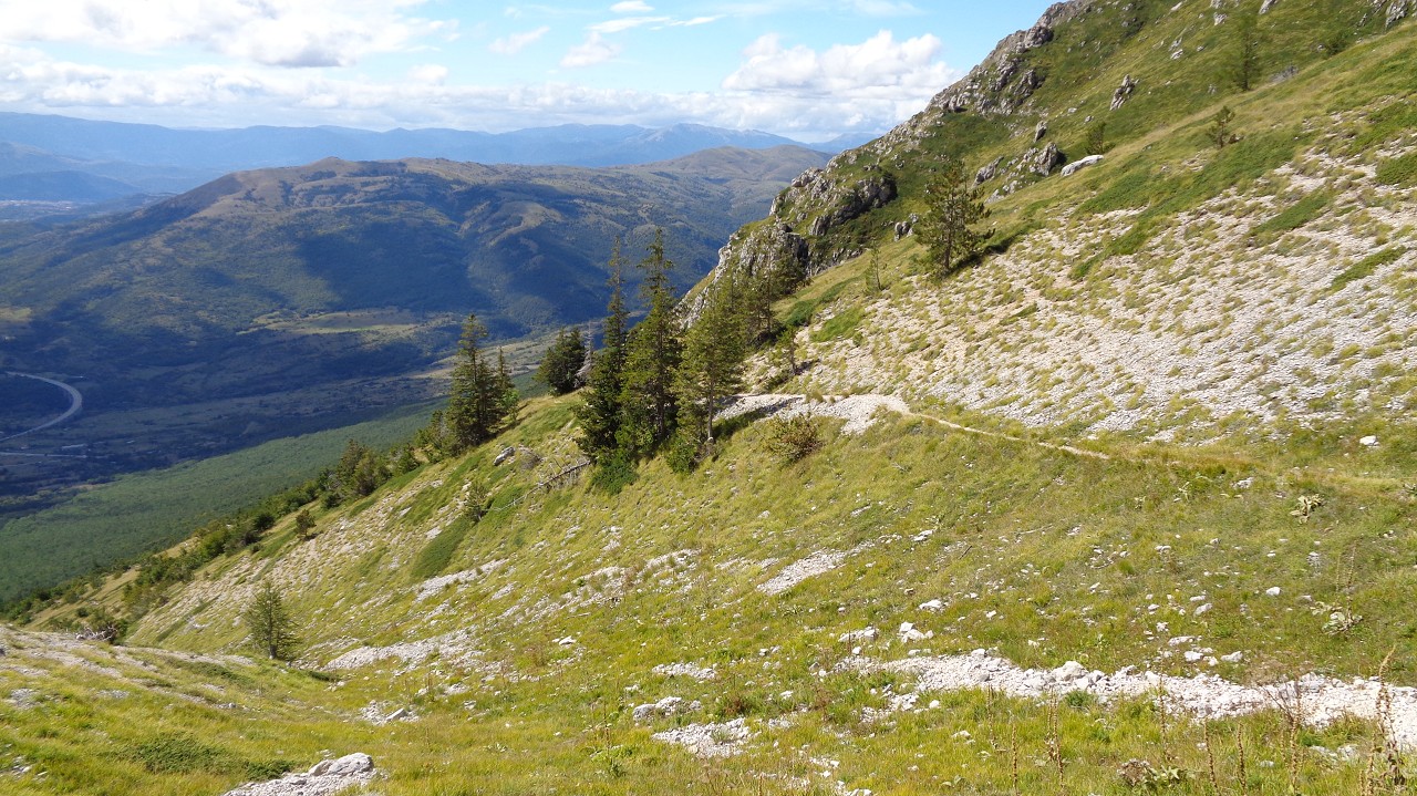 Vom Weiler Fonte Cerreto führt eine kurvenreiche Straße sowie die Seilbahn Funivia del Gran Sasso D’Italia hinauf ins Schigebiet und zum Observatorium auf der Hochebene Campo Imperatore. Die Bahn ist aber „Chiuso per Manutenzione“ (= wegen Wartungsarbeiten außer Betrieb) und so nehmen wir die 1015 Hm bis zur Bergstation zu Fuß in Angriff. Der Gipfel wäre dann nochmal 900 m höher.