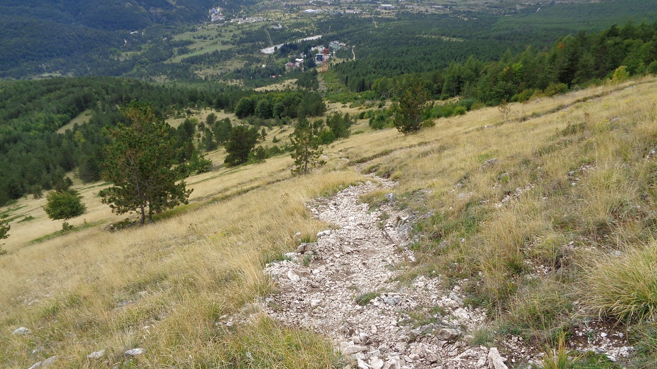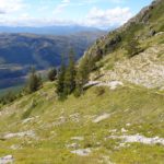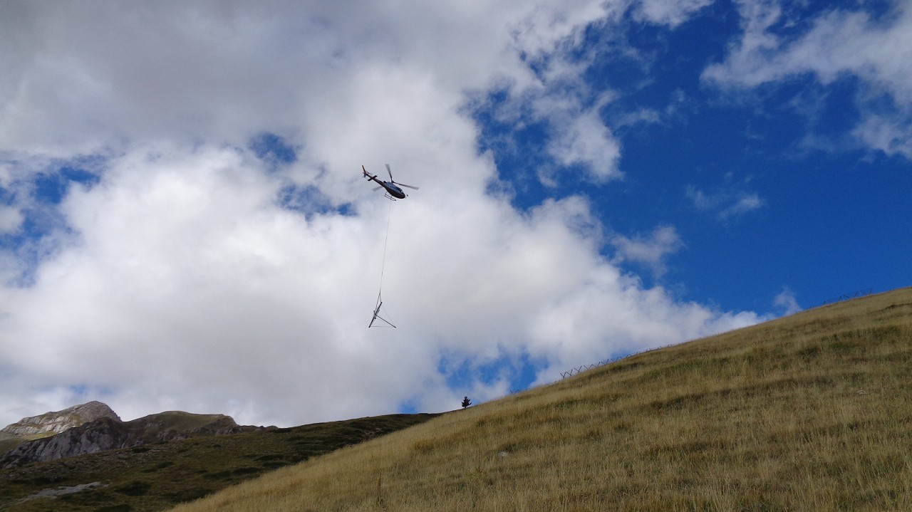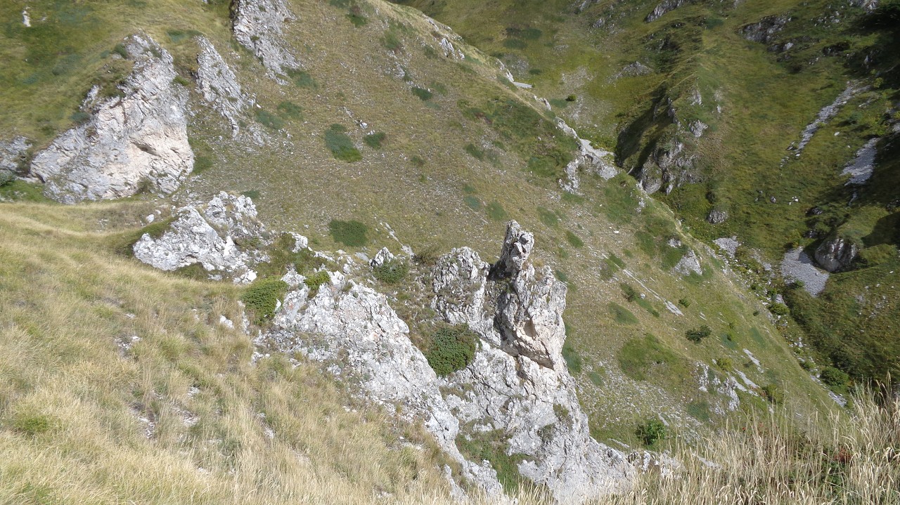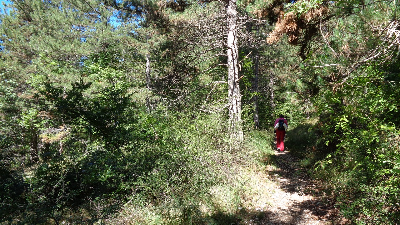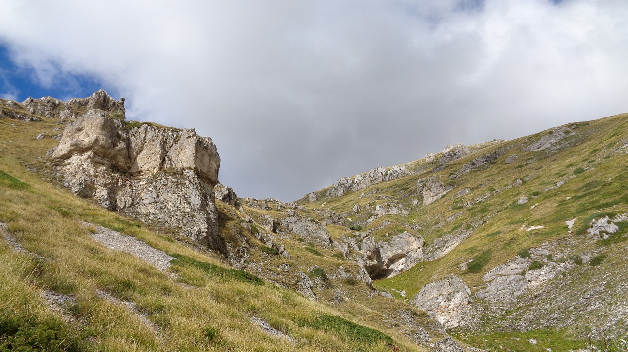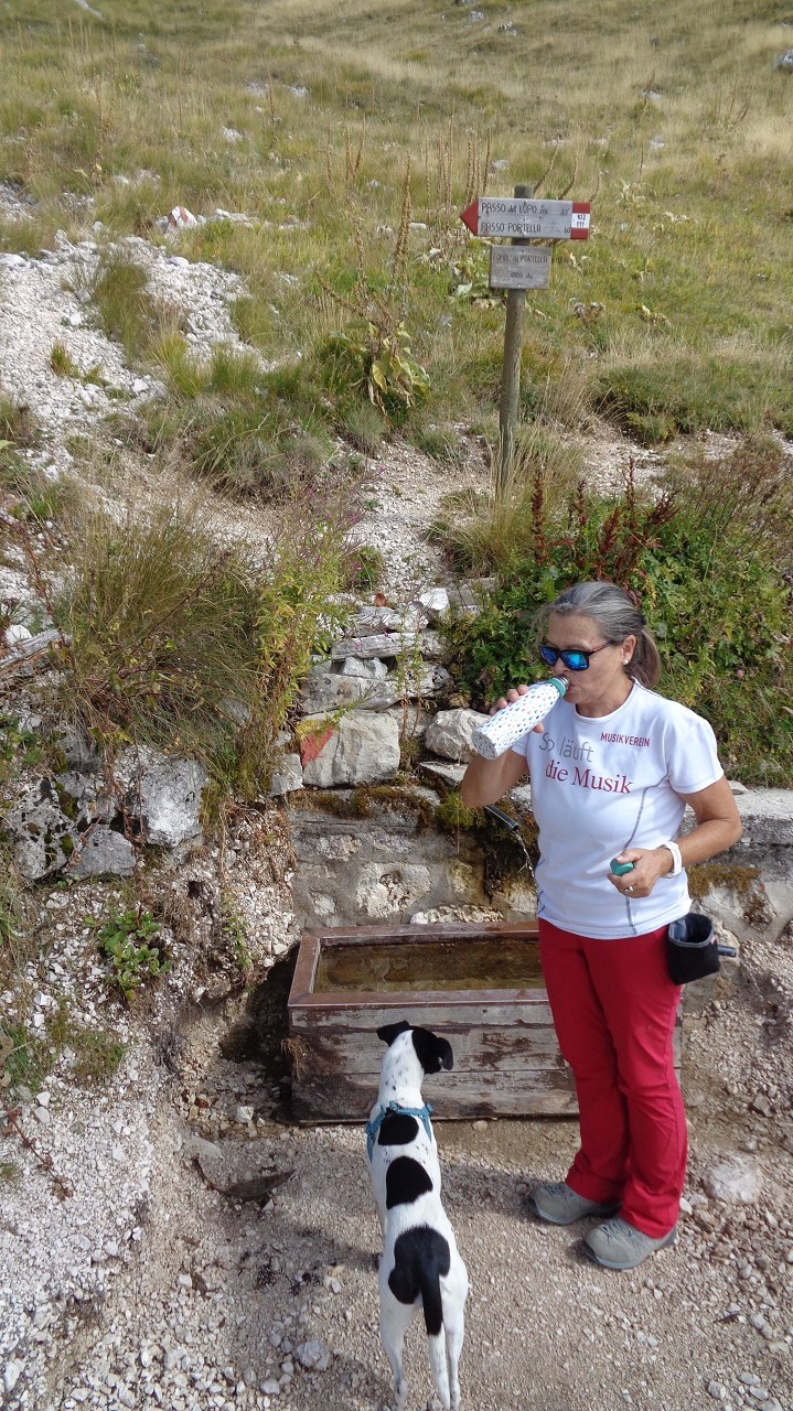 Wir starten in 1100 m Höhe am Parkplatz wo ein Hubschrauber die Stahlelemente einer Lawinenverbauung abtransportiert. Es geht hinauf zu den Hotels und zur Talstation der Seilbahn. Der Weg 102 biegt links in den Wald hinein und sogleich beginnt der Anstieg. Ohne ein flaches Stück geht es bald auf unzähligen Serpentinen hinauf und manchmal ergattern wir einen Blick ins Tal. Unaufhörlich knattert der Helikopter über unseren Köpfen unt stört die Idylle. Für einen Flug hinauf braucht er etwa 3 min, Ladung absetzen und dann wieder hinunter um das nächste Teil zu holen. Wir machen trotzdem weiter und bald sind wir etwa 500 Hm weiter oben. Jetzt lichtet sich der Wald und es gibt nur mehr vereinzelte Latschengrüppchen. Später gibt es nur mehr Gras und verschwitzt erreichen wir die kleine Quelle Fonte Della Portella auf 1880m. Hier machen wir eine Rast und verkosten das frische Quellwasser. Zum Wolfspass (Passo del Lupo) wären es noch gute 40 min und 250 Hm also nehmen wir den kaum sichtbaren Pfad nach rechts und gehen die Bergflanke entlang in Richtung Bergstation. Mitten am steilen Hang steht einsam eine Tafel mit der Warnung vor Bauarbeiten und linker Hand, etwas oberhalb von uns, liefert der Heli unaufhörlich seine Last ab. Rechts von uns ist auch eine Betonplattform in Bau, wie ein laufender Stromgenerator mit angeschlossener Mischmaschine erahnen lässt. Wir erreichen den Graben wo die Stützen und die Seile der Seilbahn bergwärts führen und in Sichtweite von der Bergstation beschließen wir den Abstieg, auch weil das Wetter umzuschlagen droht. Wir steigen steil hinab zum Wanderweg 170 und folgen den Serpentinen und können die Männer auf der Seilbahn-Gondel von oben sehen. Immer tiefer geht es in den Graben hinein und zwischen beeindruckenden Felsformationen erreichen wir die stillgelegte Mittelstation der alten Seilbahn. Hier endet plötzlich der Weg bei der neuen Stütze also steigen wir zur Betonplattform der alten Seilbahnstütze ab. Hinter dieser erkennen wir den weiteren Weg und sind froh das Ziel im Blick zu haben. Weiter geht es über eine steile Wiese auf Serpentinen talwärts und bei der ersten Stütze tauchen wir wieder in Buschland und Wald ein. Der Weg endet direkt neben der Talstation und nun ist es nicht mehr weit zurück zum Auto.