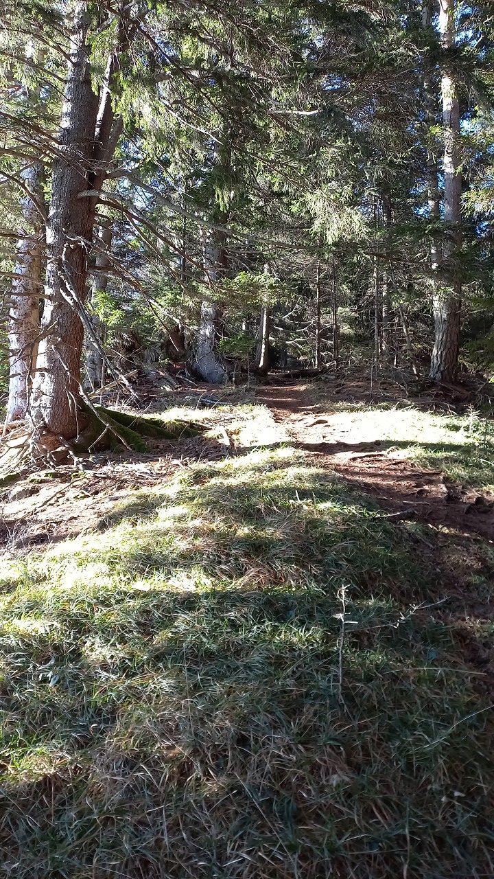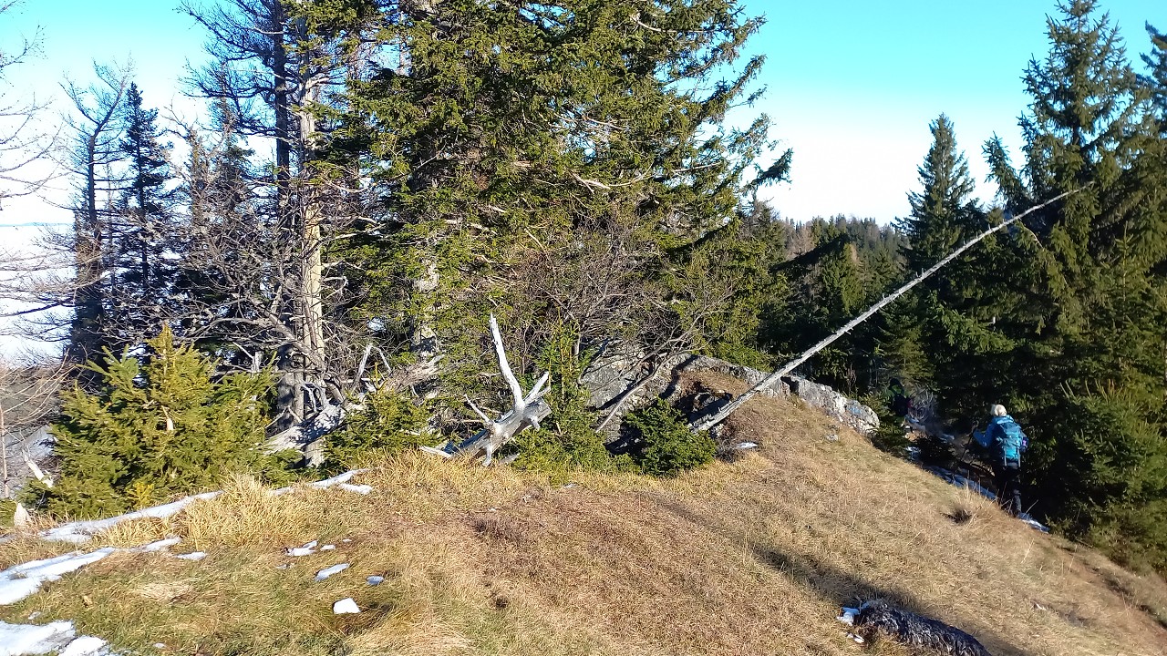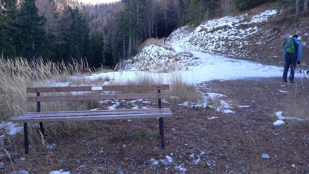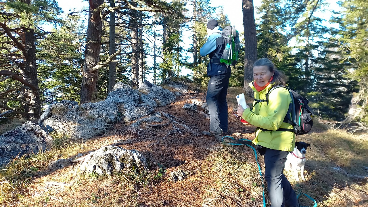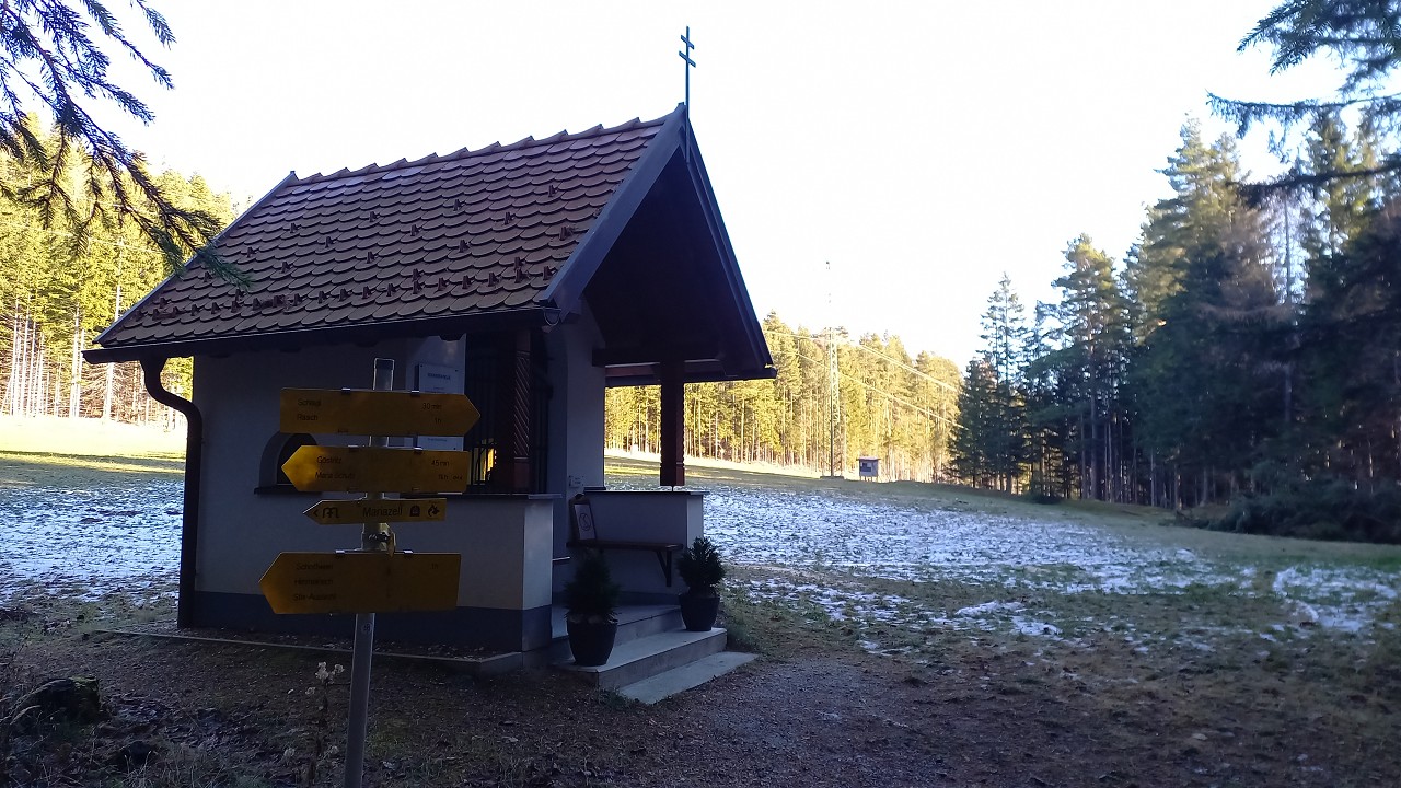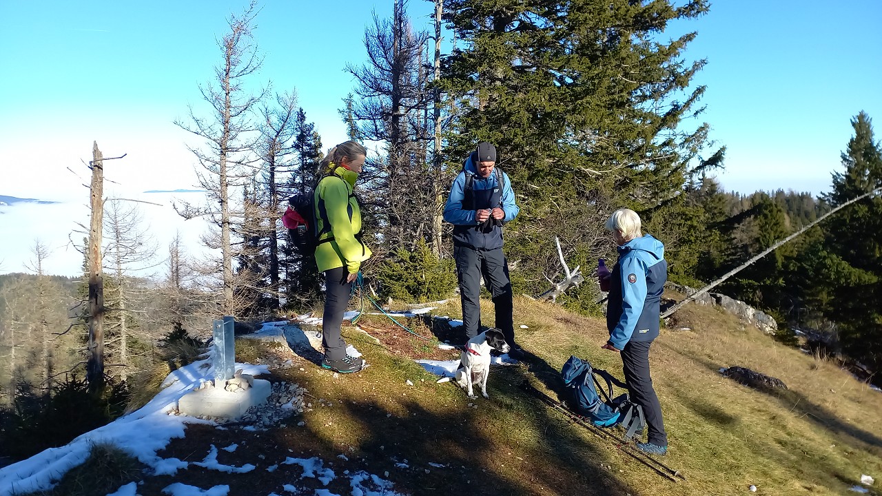 Wir starten bei der Großbaustelle des Semmering-Basistunnels im Göstritzgraben am Parkplatz für den Baustellen-Infoturm. Gleich dahinter verschwindet der Weg im Wald und es geht gleich ordentlich bergauf. Abschnittsweise steinig windet er sich ca. 200 Hm hinauf bis zur Schanzkapelle. Dort kurz durchschnaufen und weiter Richtung Kummerbauer. Der Weg ist zwar gesperrt aber wir biegen ohnehin nach ca. 120 m ab. Mit einem roten Punkt mit Pfeil markiert zweigt ein schmaler, unscheinbarer Pfad links ab, den man leicht übersehen kann. Dieser führt zuerst leicht aber bald stark ansteigend hinauf wobei die roten Punkte an einzelnen Bäumen als Wegweiser dienen. Bei einem Bankerl machen wir kurz Rast und steigen dann weiter steil in Richtung Kleinen Otter hinauf. Bei der nächsten Kreuzung mit einer Forststraße verpassen wir die Abzweigung und wandern so am Forstweg weiter bis wir bei einem Wegweiser wieder auf einen Pfad nach oben zum Sattel zwischen Kleinem Otter und Mitterotter stossen. Oben angelangt gibt es einen Wegweiser nach rechts zum Kleinen Otter und links zum Mitterotter. Ein kurzer Anstieg am Bergkamm auf nadelbedecktem, mit ein paar Schneeflecken angezuckerten Waldweg und wir erreichen einen mächtigen Felsen. Hier kommt auch rechterhand der verpasste, mit vom Windbruch umgeworfenen Bäumen verlegte Pfad herauf. Wir umgehen den Felsen und erreichen die kleine Gipfelwiese. Gute Geister haben hier schon ein Fundament betoniert, sodaß auch der Kleine bald ein ordentliches Gipfelkreuz haben wird (↑ nächsten Besuch einplanen). Das hier ein ganz besonderer Ort ist zeigt der tolle Tiefblick auf die höheren Gipfel der Wiener Hausberge welche wie Inseln aus dem Nebelmeer herausragen. Um das vielleicht zu spüren, müsst ihr selber herauf kommen.