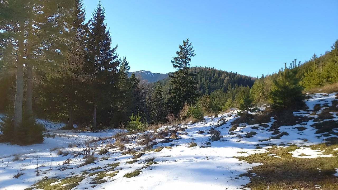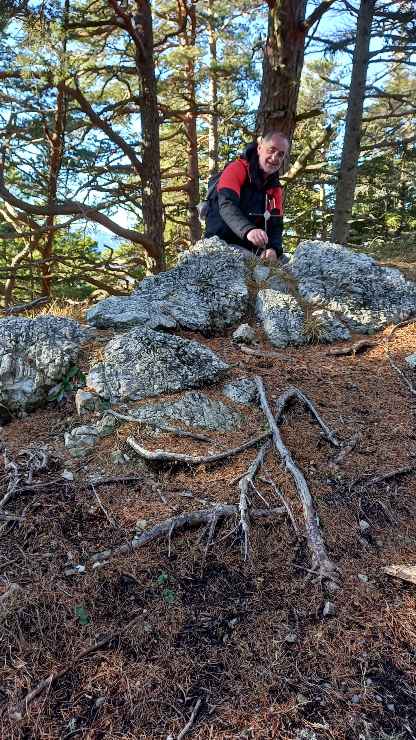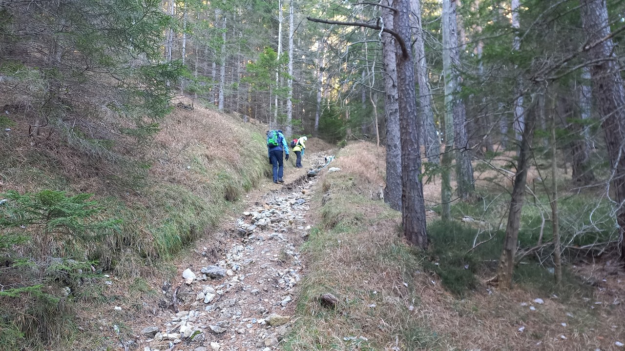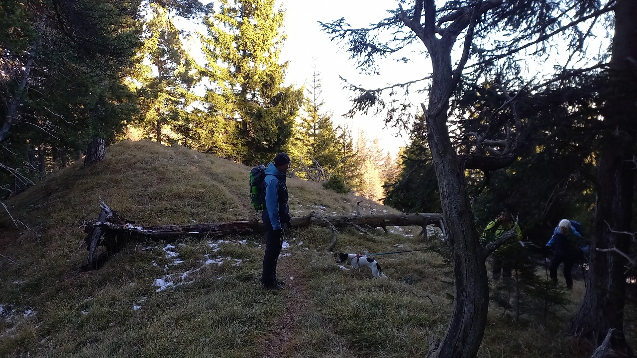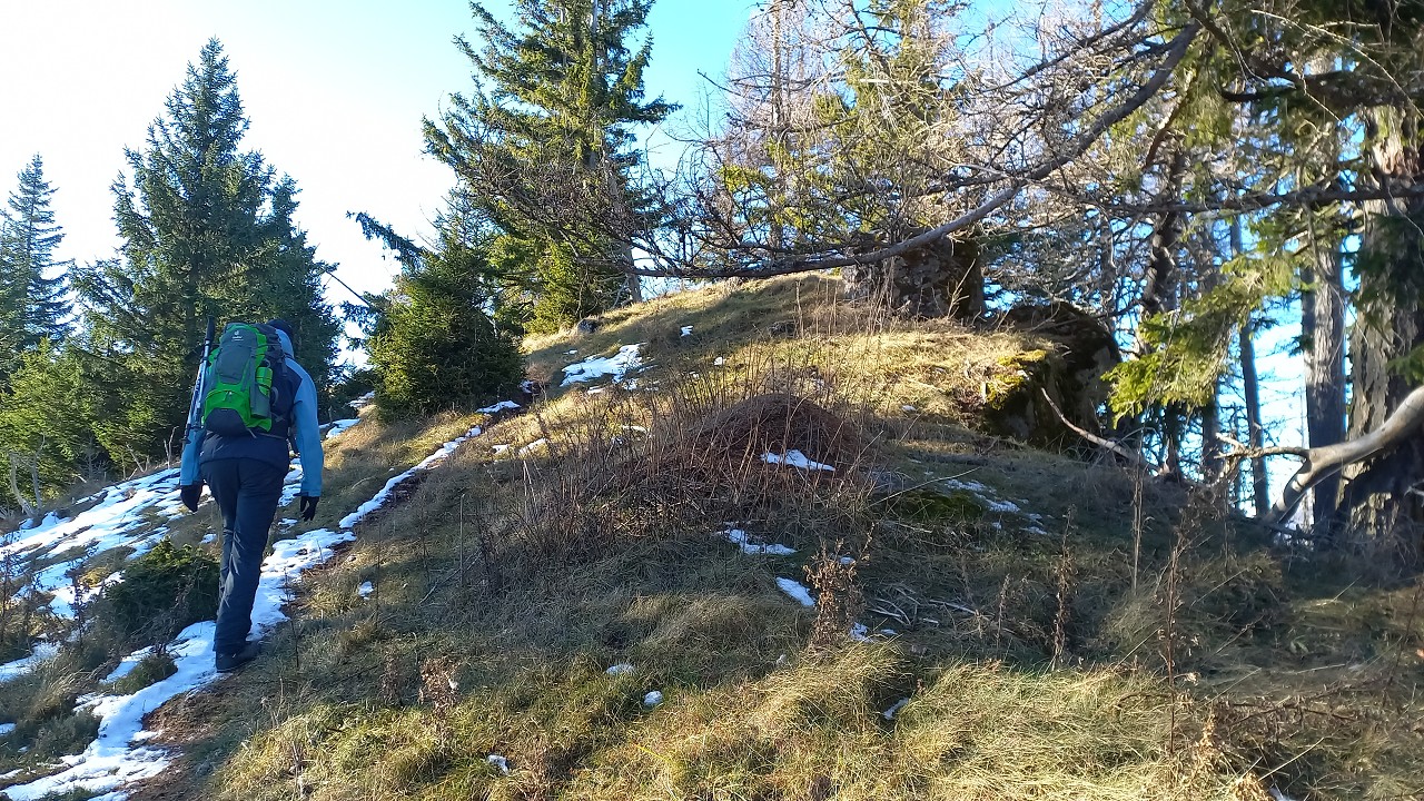 Wir starten bei der Großbaustelle des Semmering-Basistunnels im Göstritzgraben am Parkplatz für den Baustellen-Infoturm. Gleich dahinter verschwindet der Weg im Wald und es geht gleich ordentlich bergauf. Abschnittsweise steinig windet er sich ca. 200 Hm hinauf bis zur Schanzkapelle. Dort kurz durchschnaufen und weiter Richtung Kummerbauer. Der Weg ist zwar gesperrt aber wir biegen ohnehin nach ca. 120 m ab. Mit einem roten Punkt mit Pfeil markiert zweigt ein schmaler, unscheinbarer Pfad links ab, den man leicht übersehen kann. Dieser führt zuerst leicht aber bald stark ansteigend hinauf wobei die roten Punkte an einzelnen Bäumen als Wegweiser dienen. Bei einem Bankerl machen wir kurz Rast und steigen dann weiter steil in Richtung Kleinen Otter hinauf. Bei der nächsten Kreuzung mit einer Forststraße verpassen wir die Abzweigung und wandern so am Forstweg weiter bis wir bei einem Wegweiser wieder auf einen Pfad nach oben zum Sattel zwischen Kleinem Otter und Mitterotter stossen. Oben angelangt gibt es einen Wegweiser nach rechts zum Kleinen Otter und links zum Mitterotter. Ein kurzer Anstieg am Bergkamm auf nadelbedecktem, mit ein paar Schneeflecken angezuckerten Waldweg und wir erreichen einen mächtigen Felsen. Hier kommt auch rechterhand der verpasste, mit vom Windbruch umgeworfenen Bäumen verlegte Pfad herauf. Wir umgehen den Felsen und erreichen die kleine Gipfelwiese. Gute Geister haben hier schon ein Fundament betoniert, sodaß auch der Kleine bald ein ordentliches Gipfelkreuz haben wird (↑ nächsten Besuch einplanen). Das hier ein ganz besonderer Ort ist zeigt der tolle Tiefblick auf die höheren Gipfel der Wiener Hausberge welche wie Inseln aus dem Nebelmeer herausragen. Um das vielleicht zu spüren, müsst ihr selber herauf kommen.