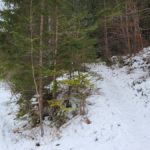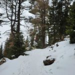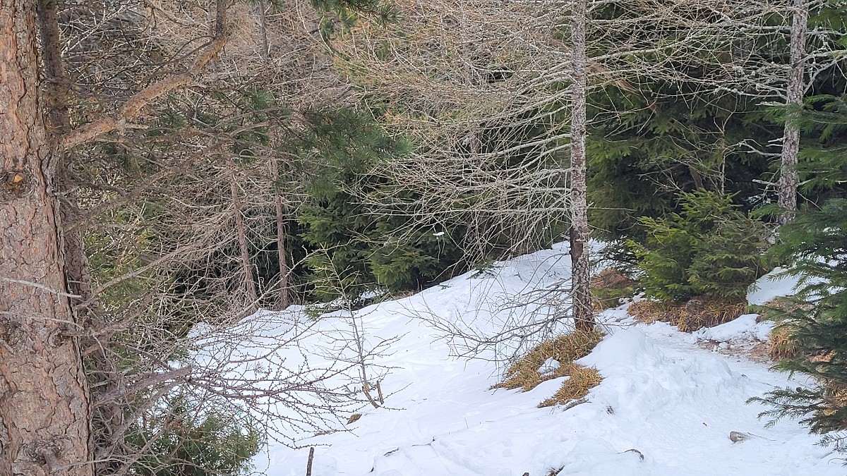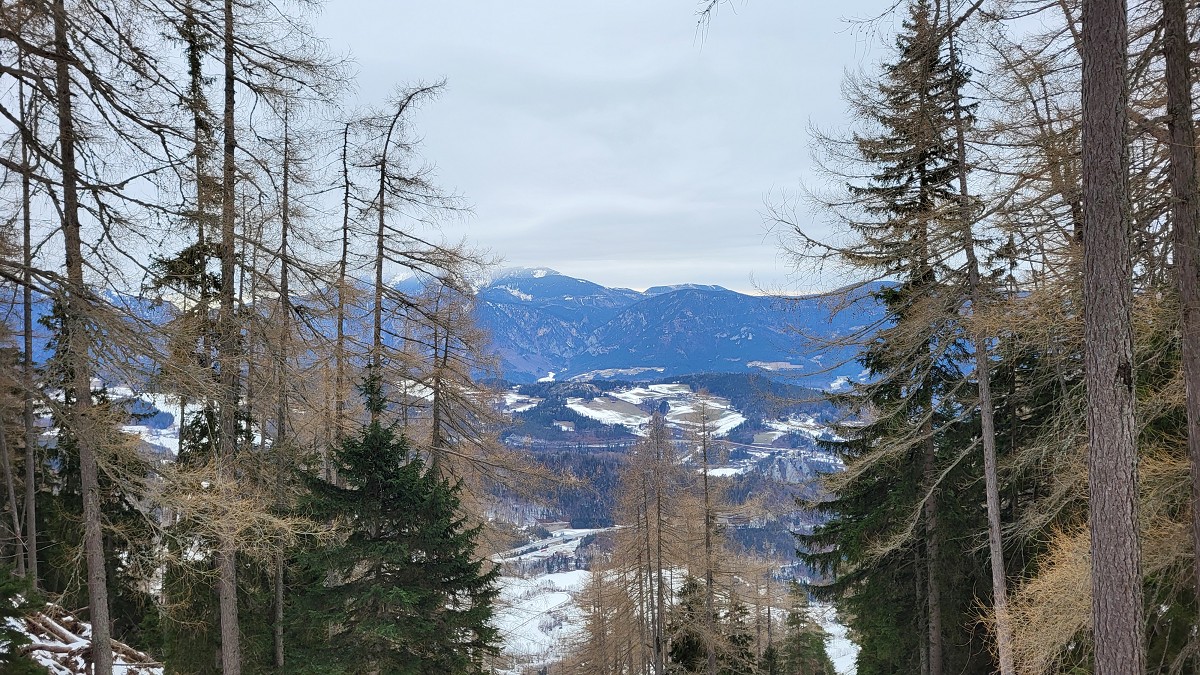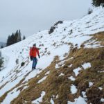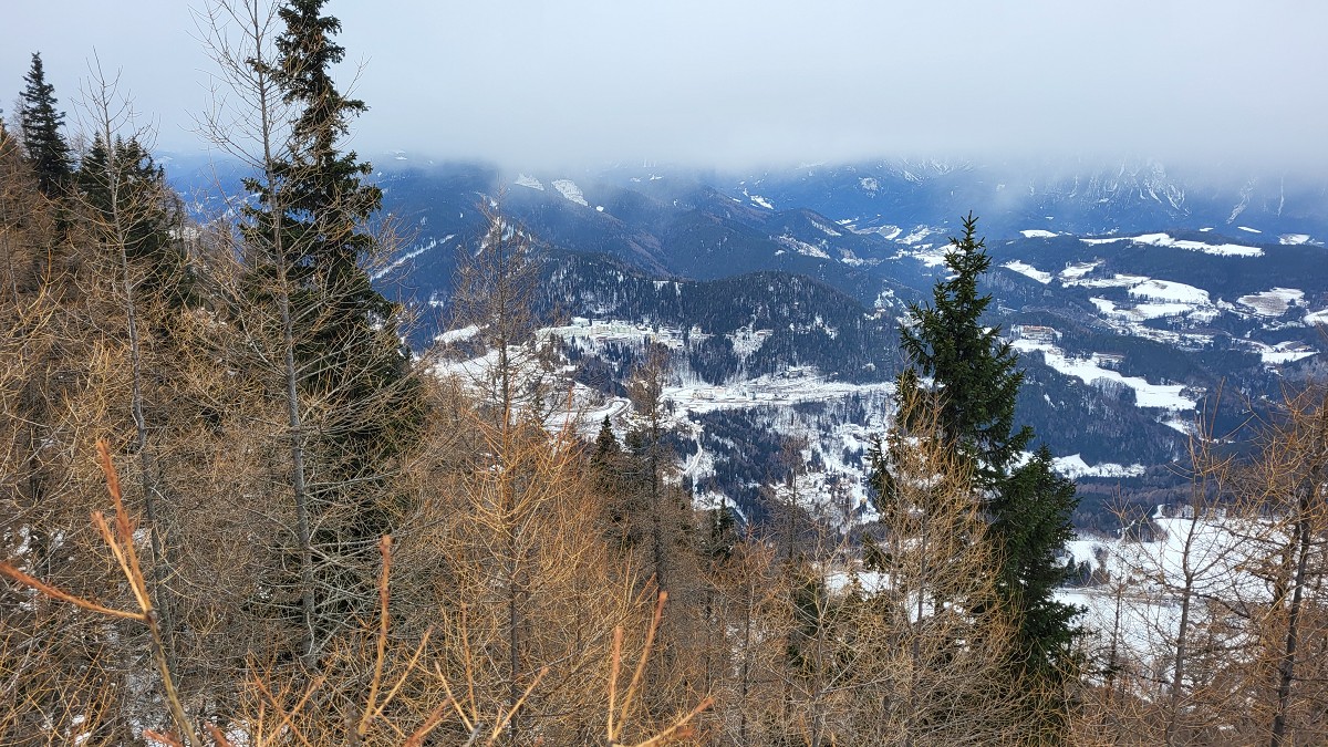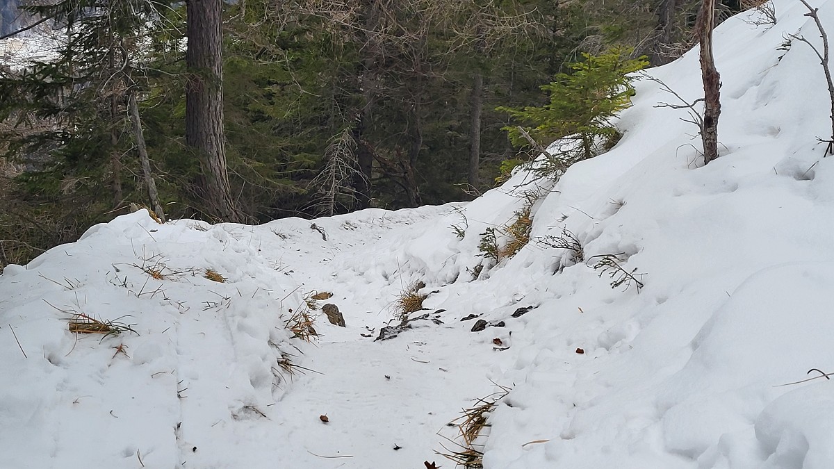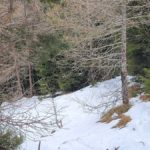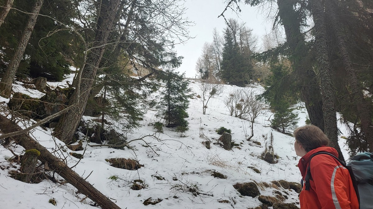 Wir steigen über den steilen Gebirgsjägersteig auf. Aussicht gibt es unterwegs kaum. Es geht durchwegs durch bewaldetes Gebiet. Stellenweise ist es sehr glatt. Ich rutsche mehrmals aus und bereue meine Grödel nicht mitgenommen zu haben. Auf halber Höhe entdeckt Stepahn einige Rehe, die jedoch sofort wieder verschwunden sind.