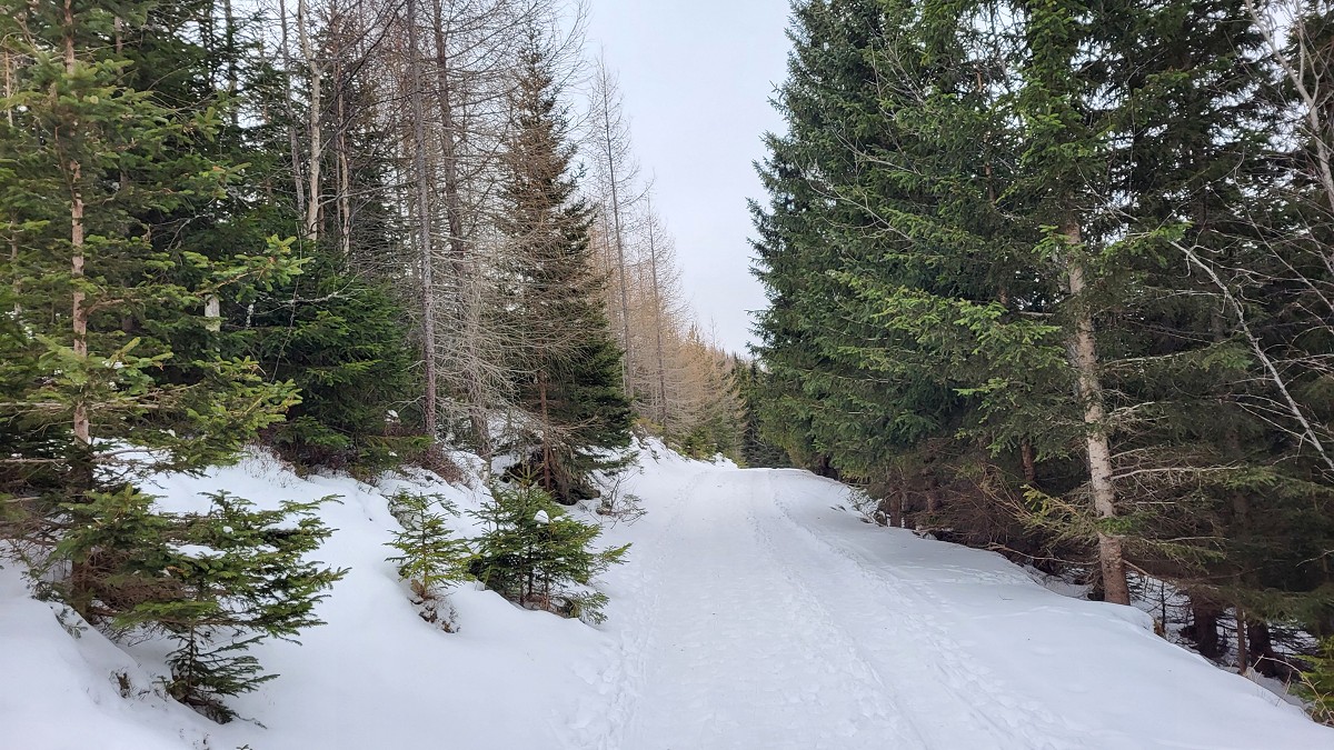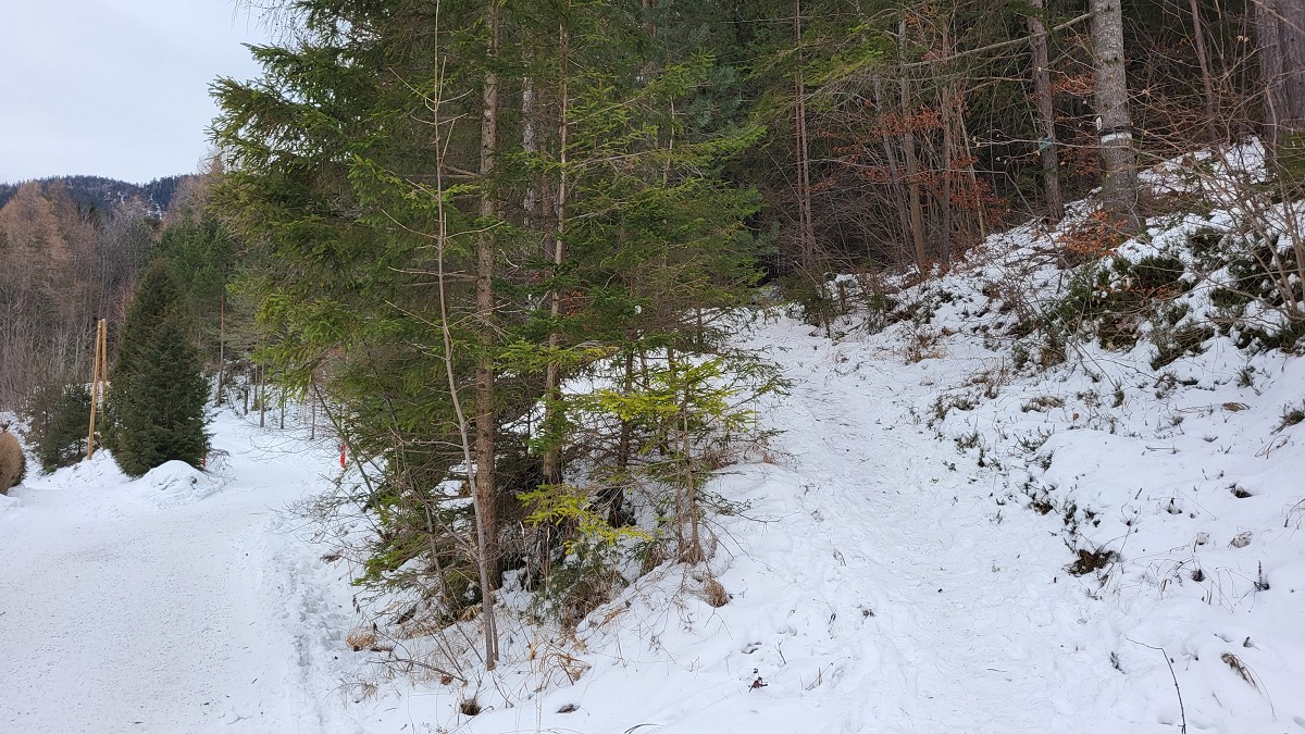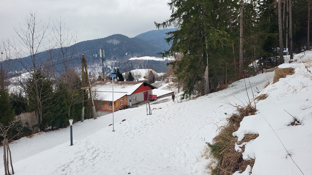 Wir parken, von Gloggnitz kommend, am Parkplatz nach der Kirche. Gleich gegenüber beginnt die Tour auf einer breiten, schneebedeckten Forststraße.
