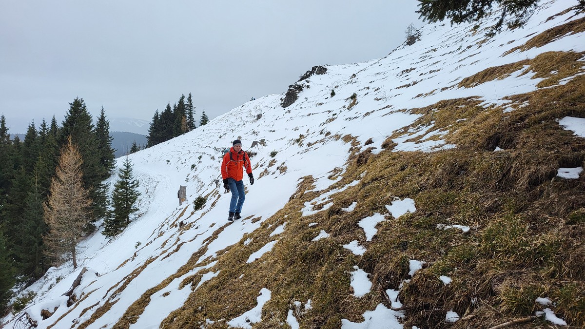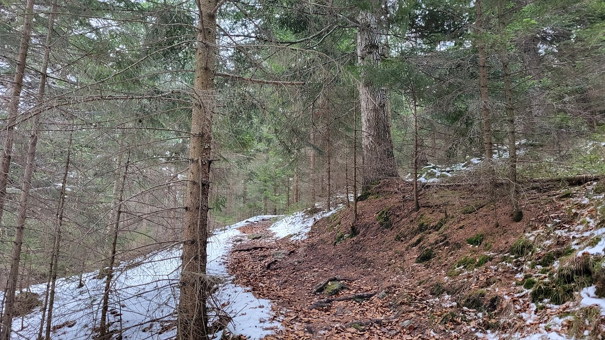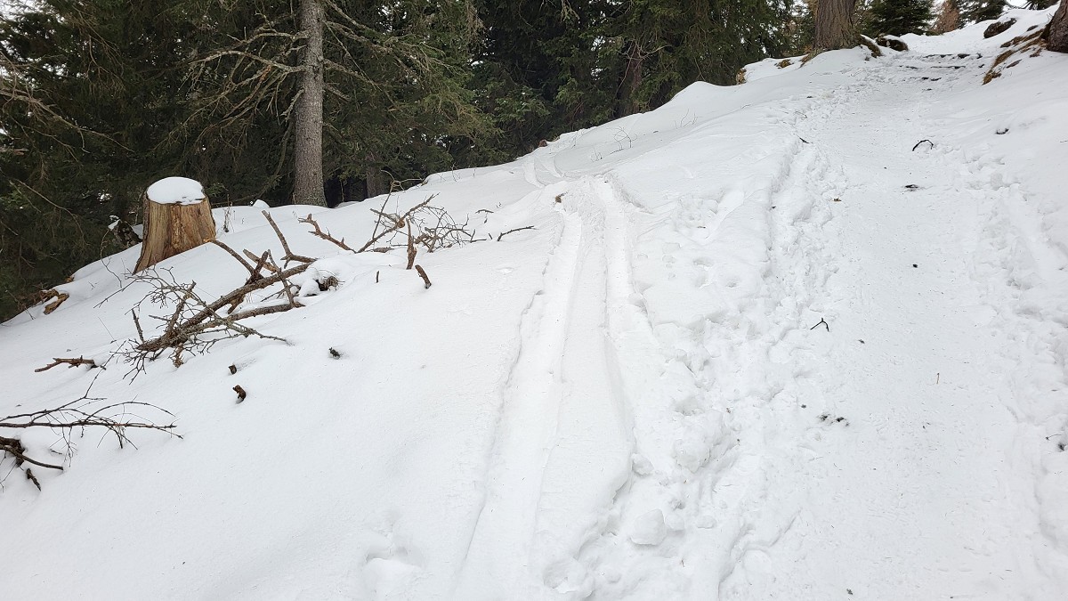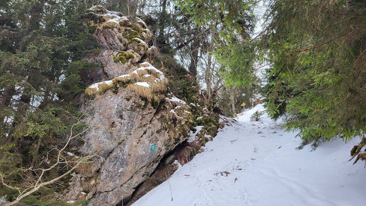 Der Weg ist ausgetreten und daher trotz Schneelage gut zu erkennen. Die grüne Markierung ist es nicht. In Bewegung ist uns rasch warm und Stephan überlegt sogar den Pullover auszuziehen.