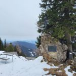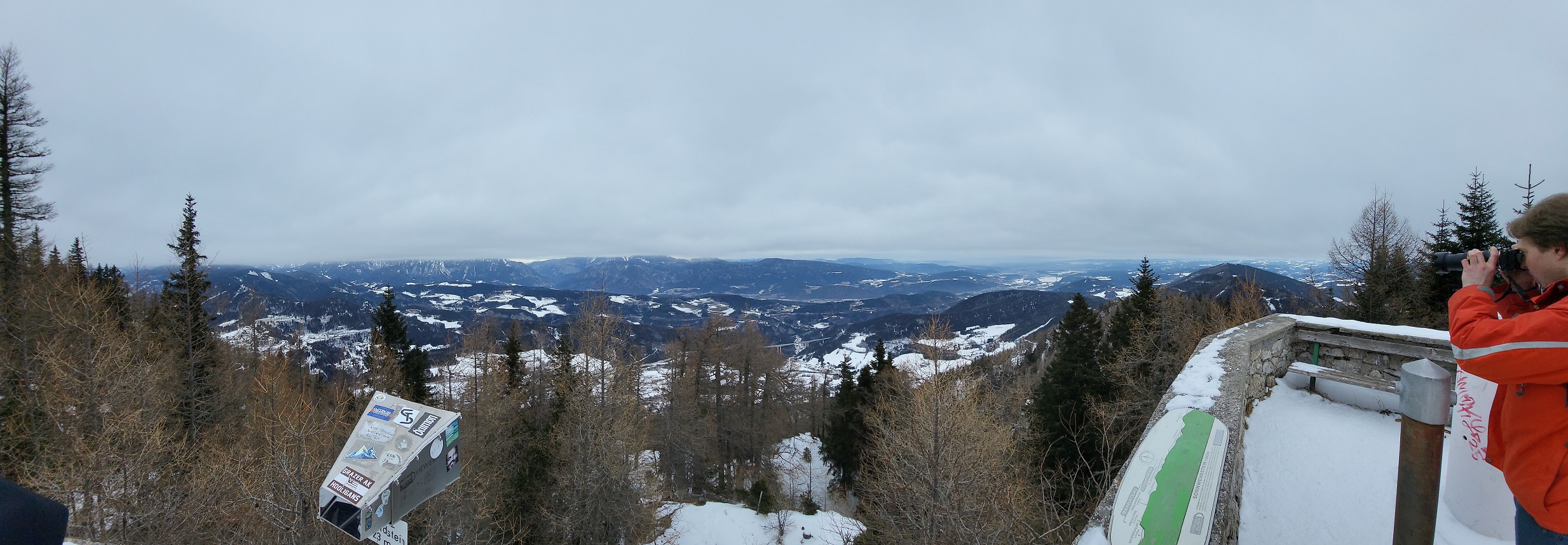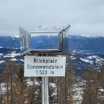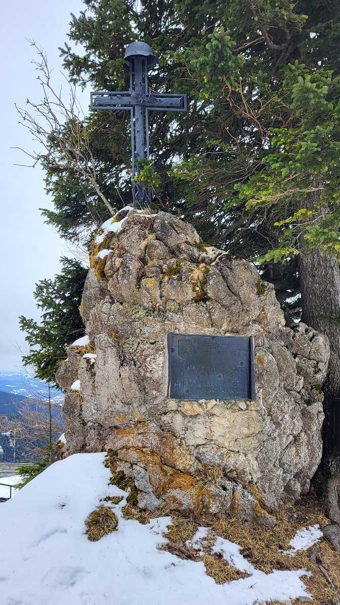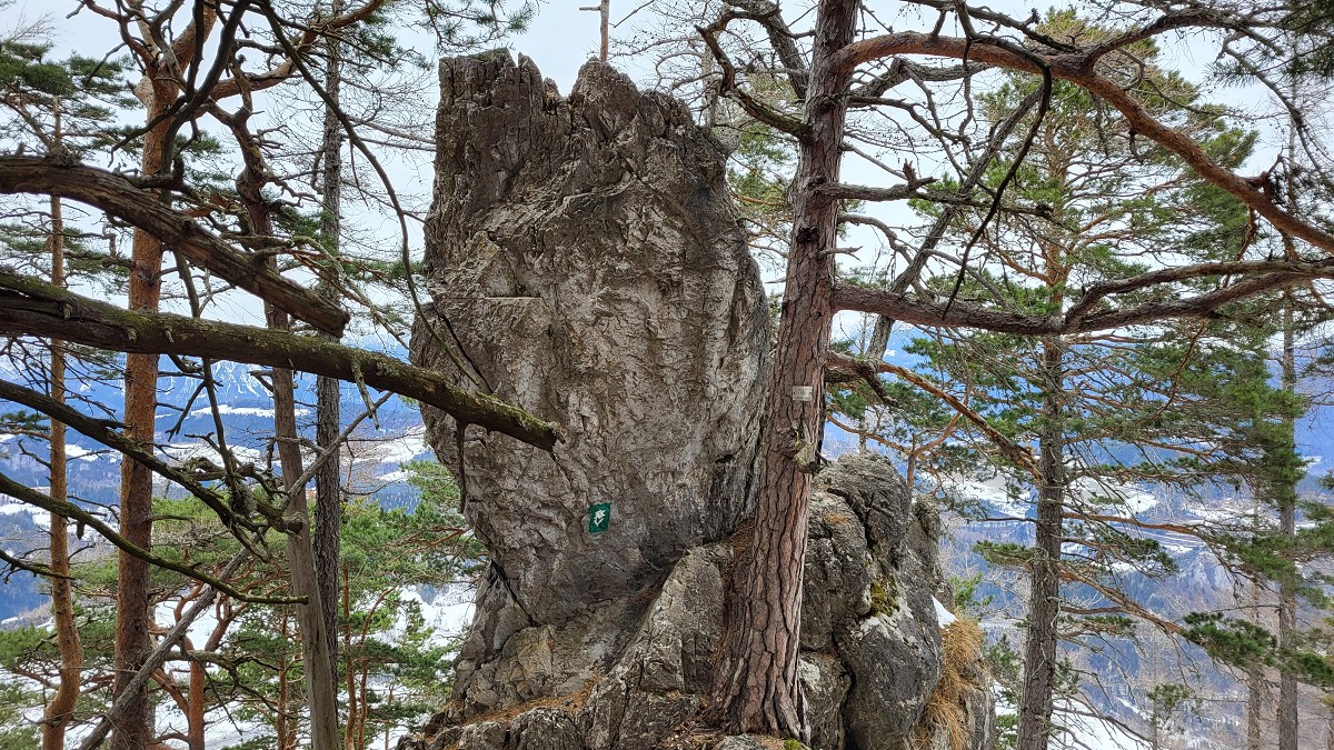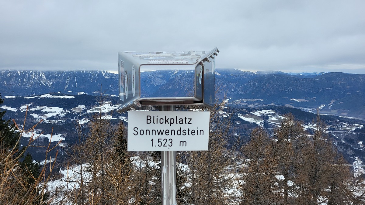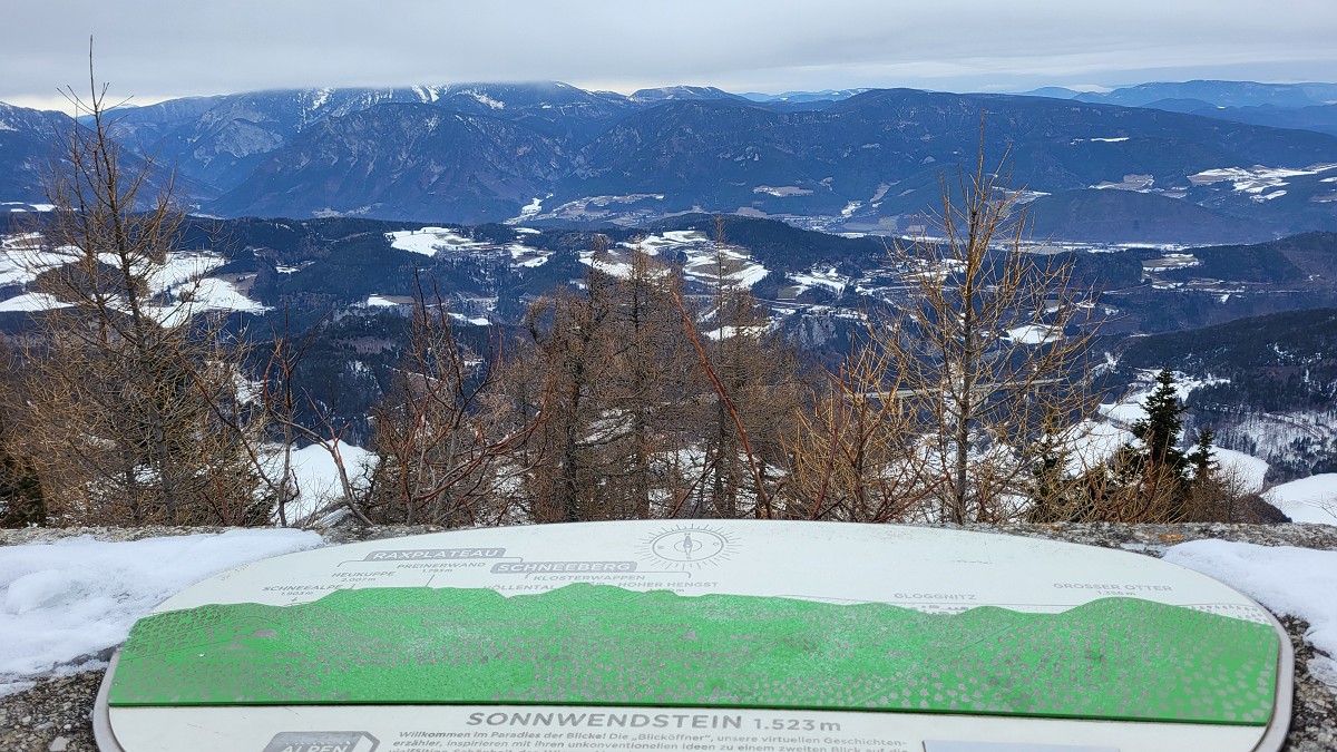 nach knapp drei Stunden. Da die Hütte Winterpause macht, gehen wir gleich weiter zum Gipfel des Sonnwendsteins (1523 m) mit der Aussichtsplattform. Gott sei Dank ist es windstill und wir machen Mittagspause.