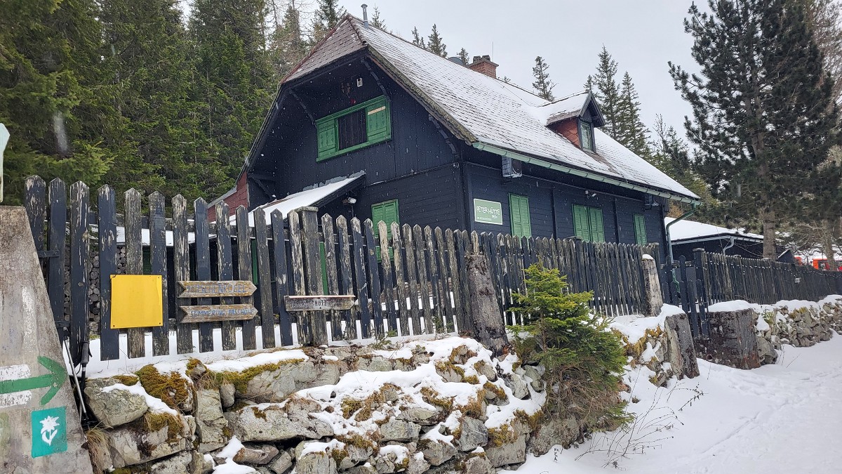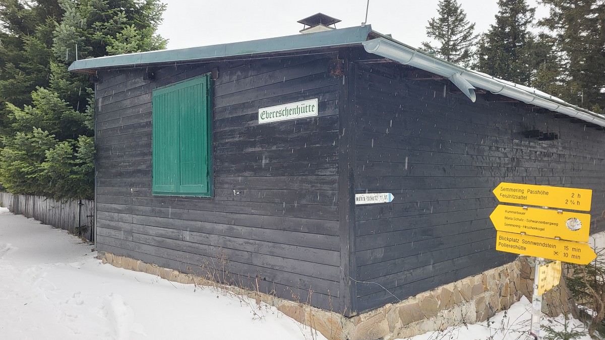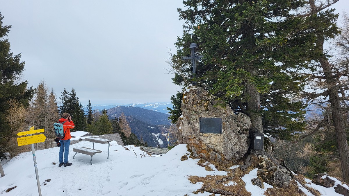 Da wir gut in der Zeit liegen, gehen wir noch weiter zum Erzkogel (1504 m). Wir verpassen die richtige Abzweigung, umrunden den Gipfel teilweise und erklimmen ihn schlussendlich auf direktem Wege. Nach der Eintragung ins Gipfelbuch treten wir den Rückweg an. Ein kleines Stück geht es am selben Weg zurück, bei der Ebereschenhütte zweigen wir links ab und gelangen am Almsteig wieder zurück nach Maria Schutz. Dort kehren wir beim Kirchenwirt ein, der für seine Klosterkrapfen „weltberühmt in Maria Schutz“ ist.