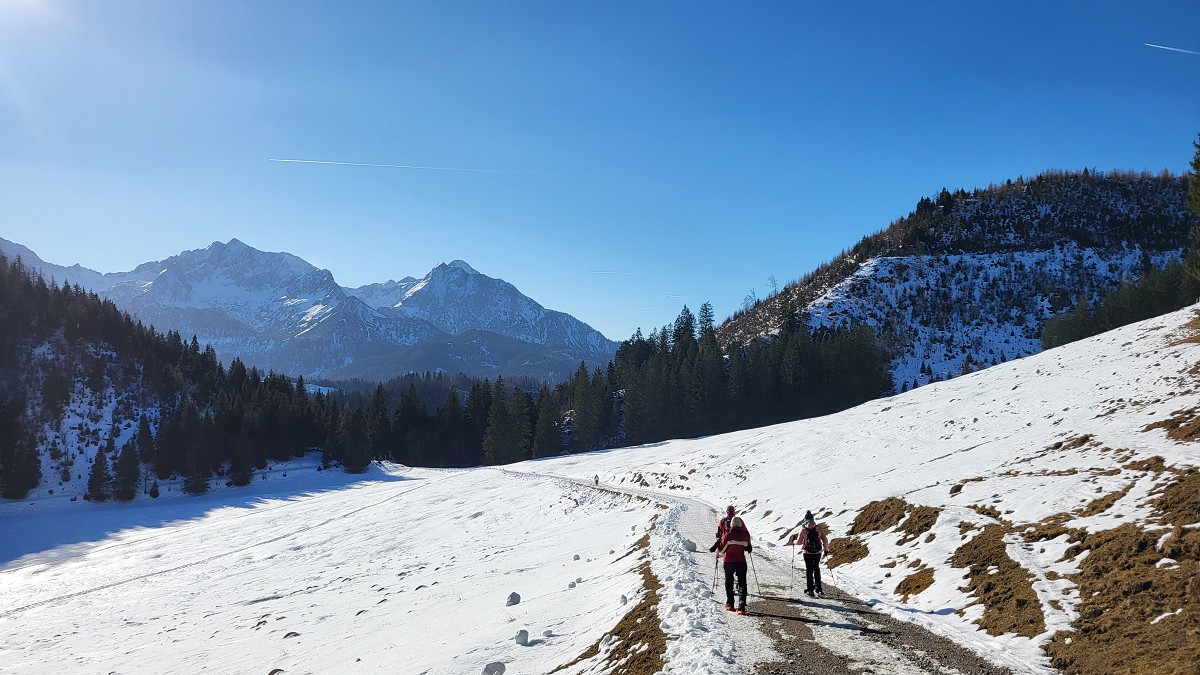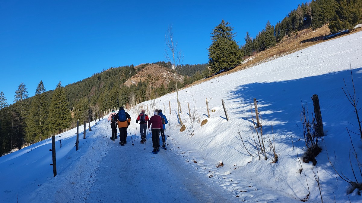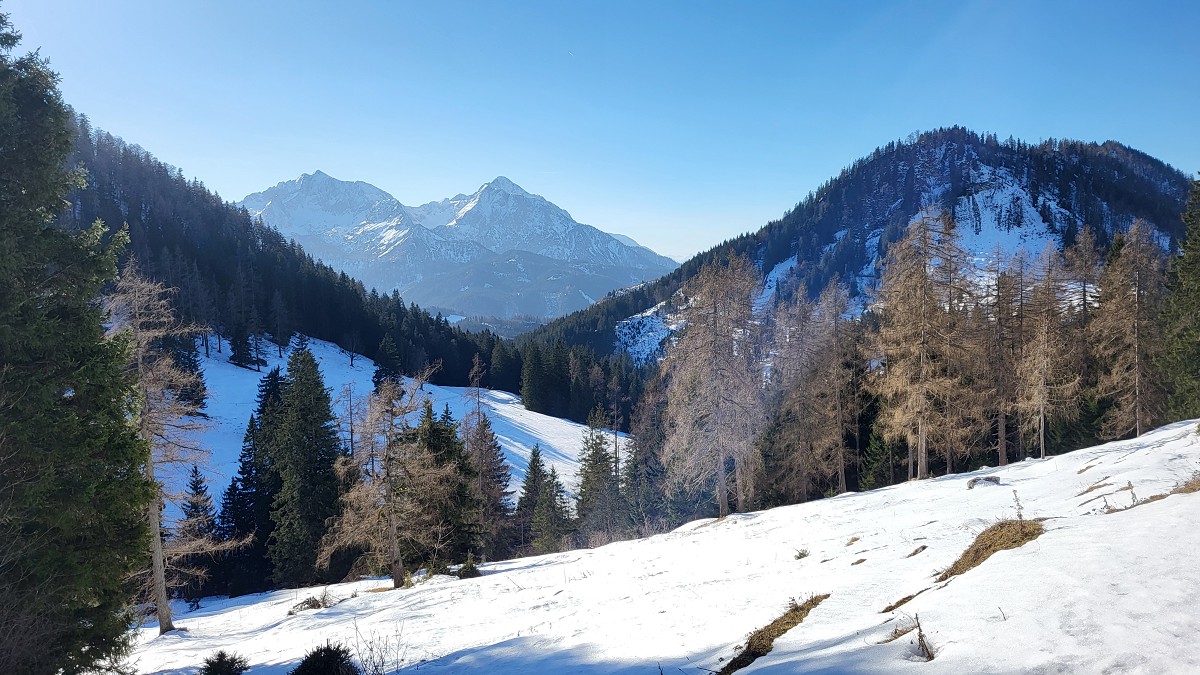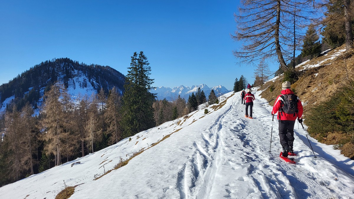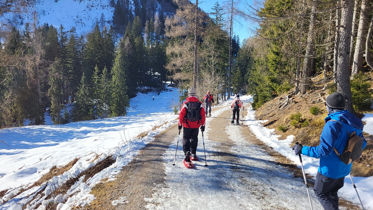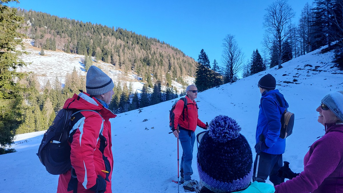 Diesmal liegt Schnee in Hinterstoder. Nicht viel, aber wir sind optimistisch und fahren mit dem Hotelbus auf den Hengstpass bei Rosenau. Wir parken am Parkplatz gegenüber der Zickerreith. Schneeschuhe anziehen und los geht es am Forstweg Richtung Norden.
