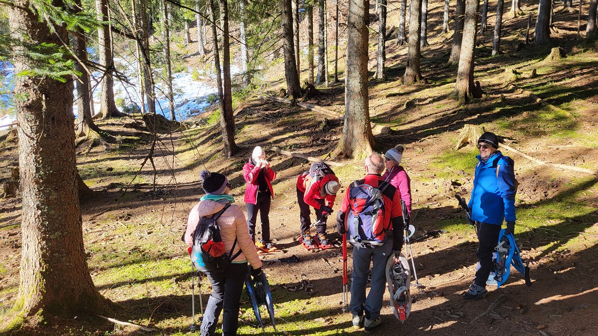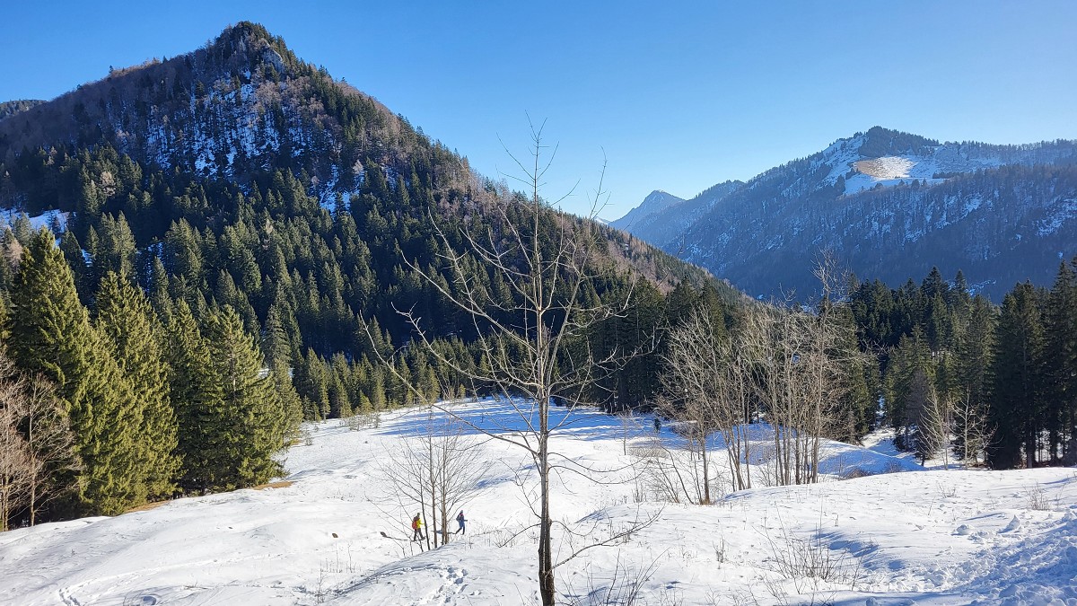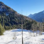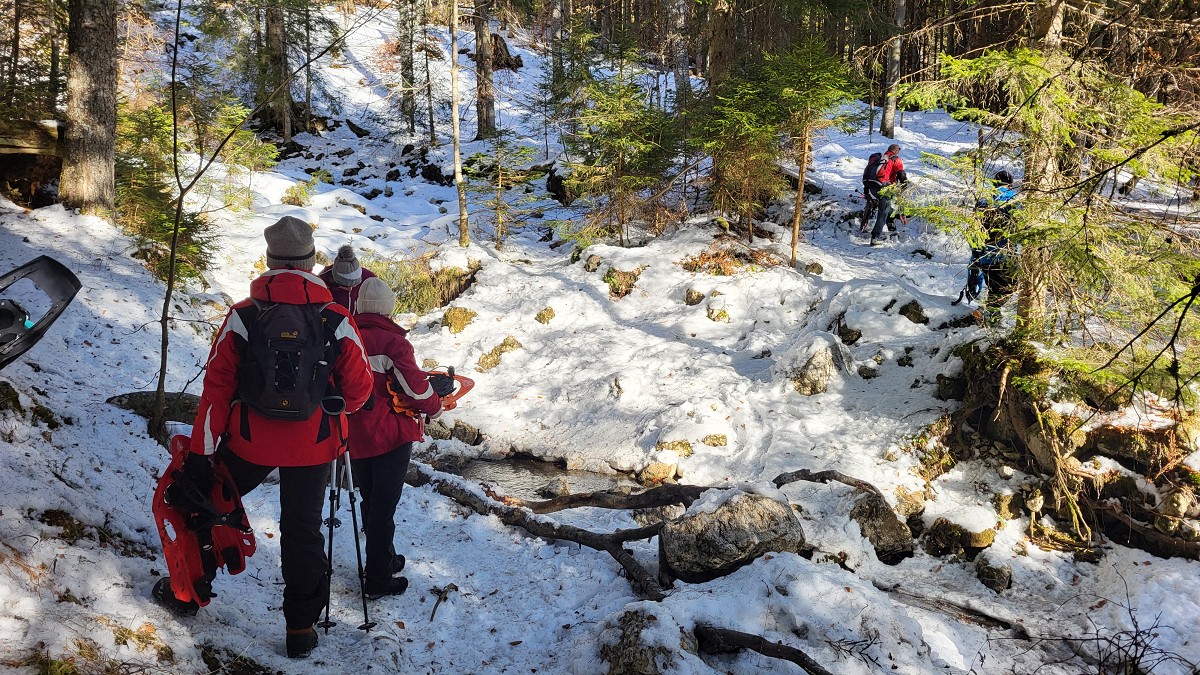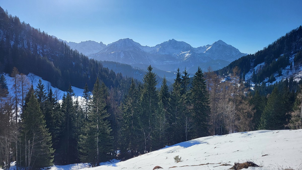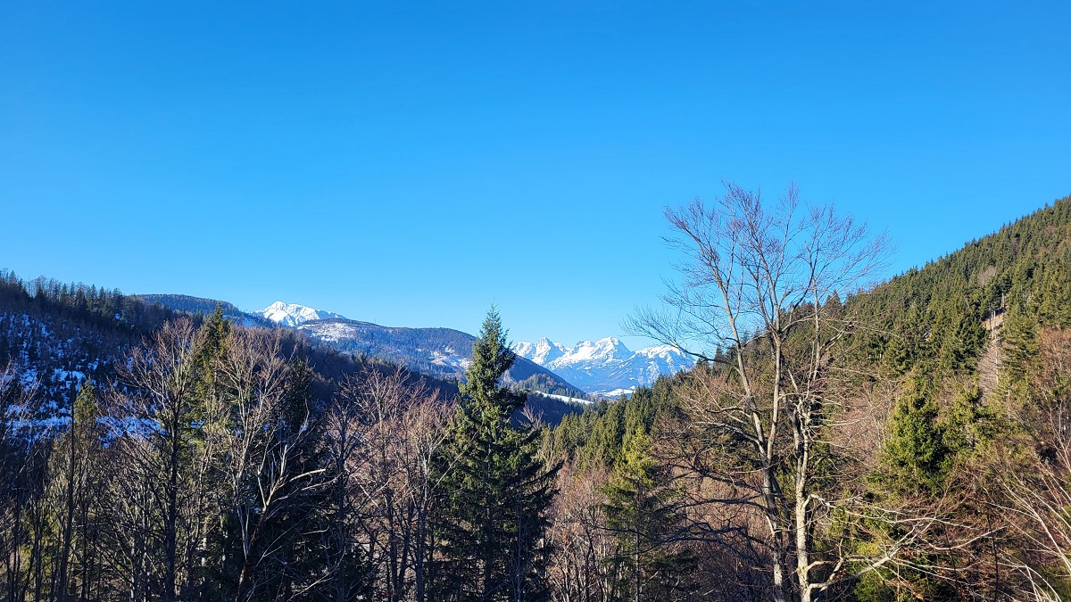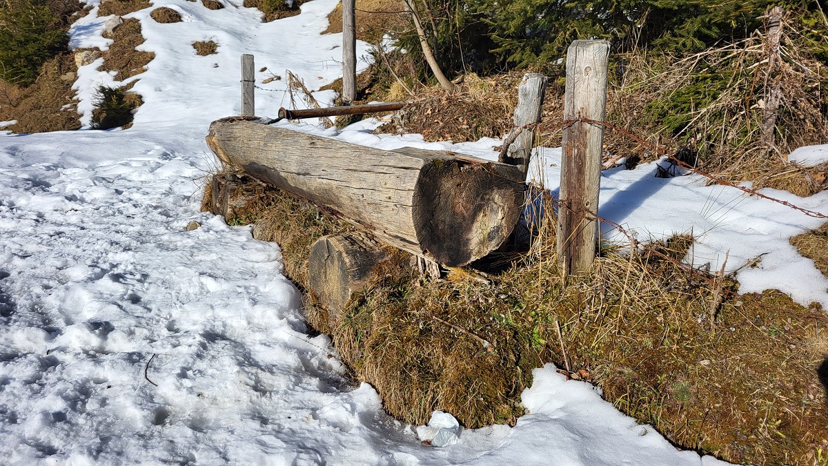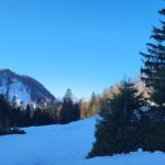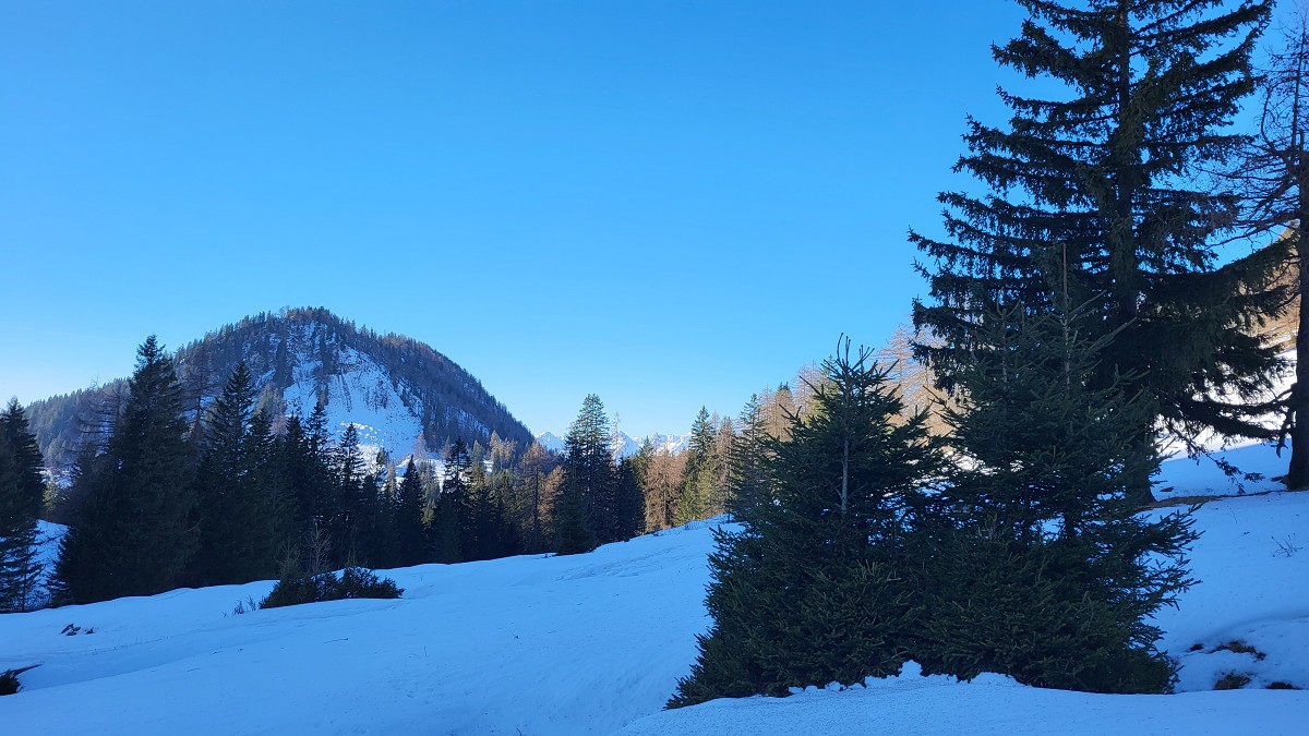 Diesmal liegt Schnee in Hinterstoder. Nicht viel, aber wir sind optimistisch und fahren mit dem Hotelbus auf den Hengstpass bei Rosenau. Wir parken am Parkplatz gegenüber der Zickerreith. Schneeschuhe anziehen und los geht es am Forstweg Richtung Norden.