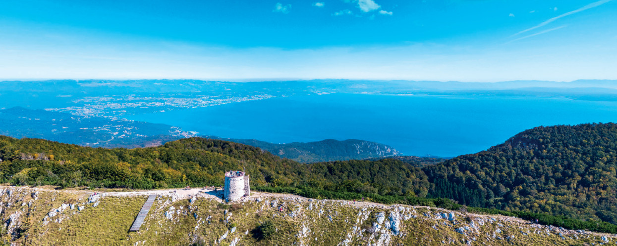 Von seinem Gipfel ergibt sich ein überwältigender Tiefblick auf die Inseln Krk und Cres sowie auf die Küstenorte an der Kvarner Bucht.